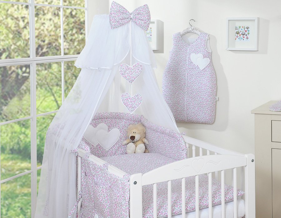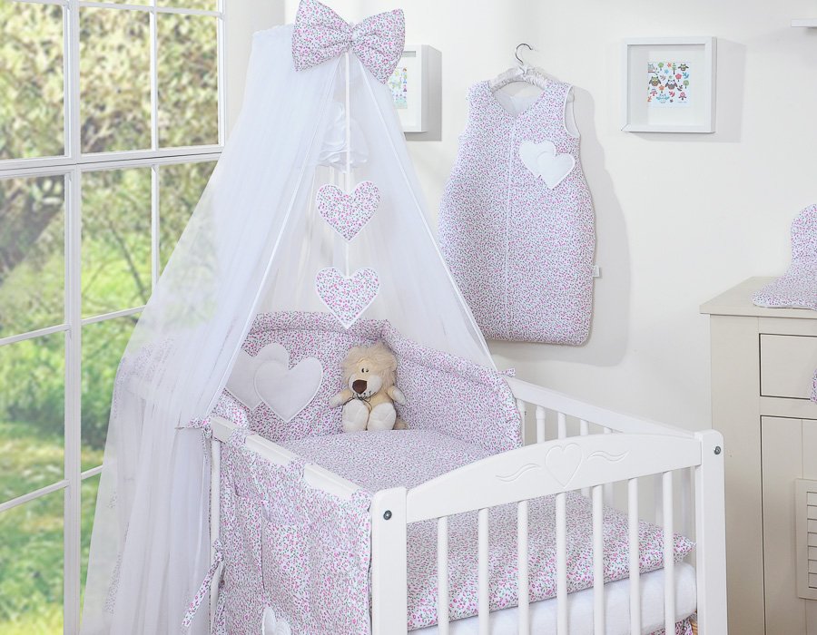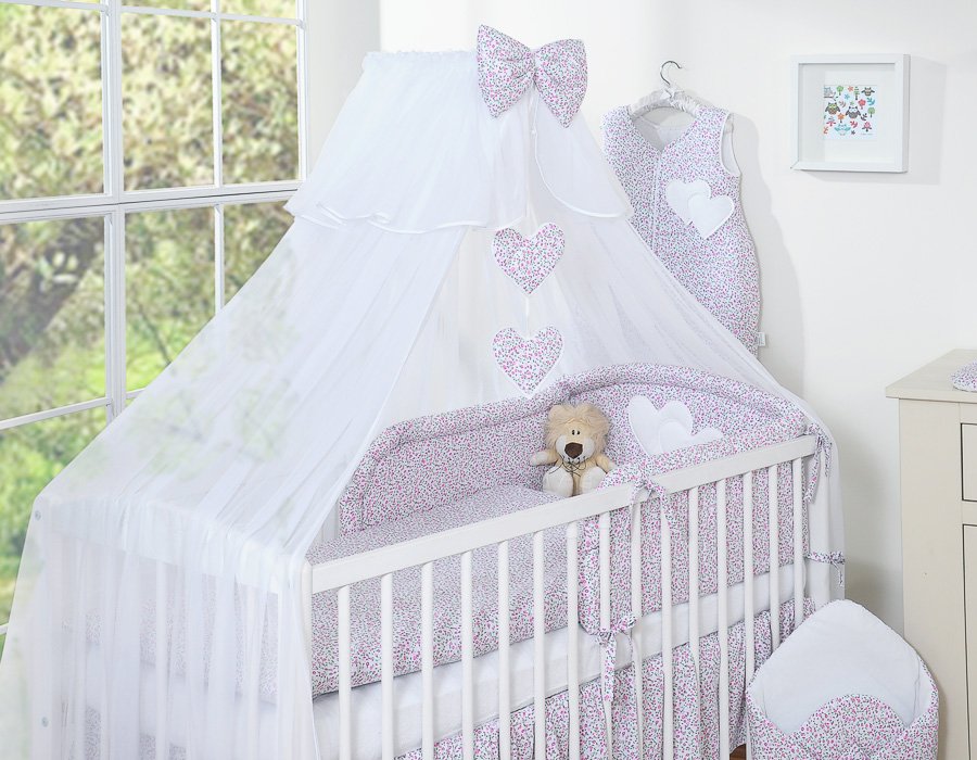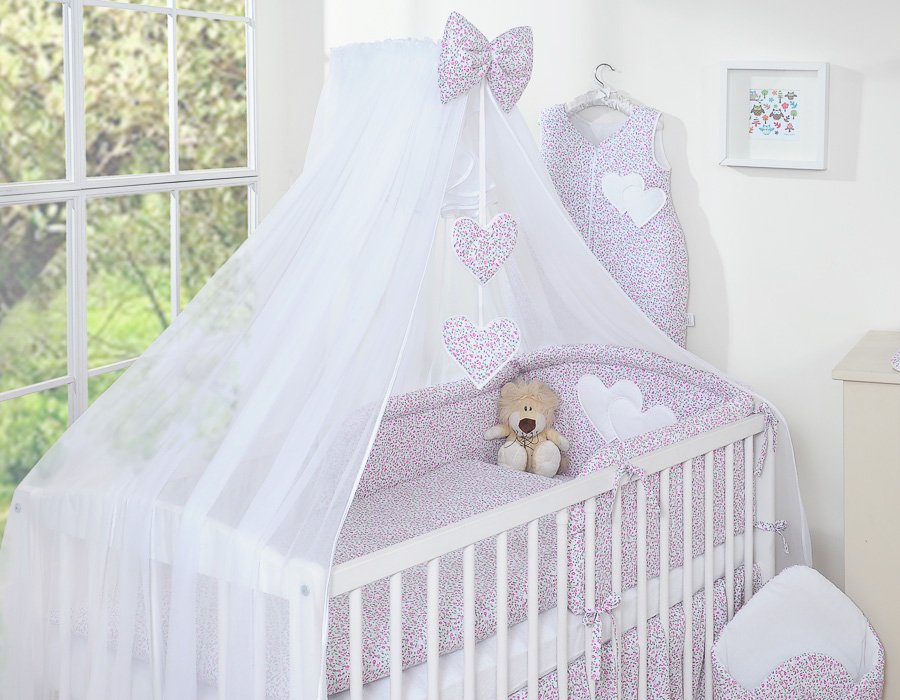 Bedding set 5-pcs with mosquito-net- Hanging Hearts pink flowers