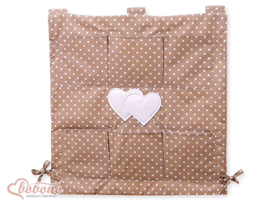 Cot tidy- Hanging Hearts white dots on brown