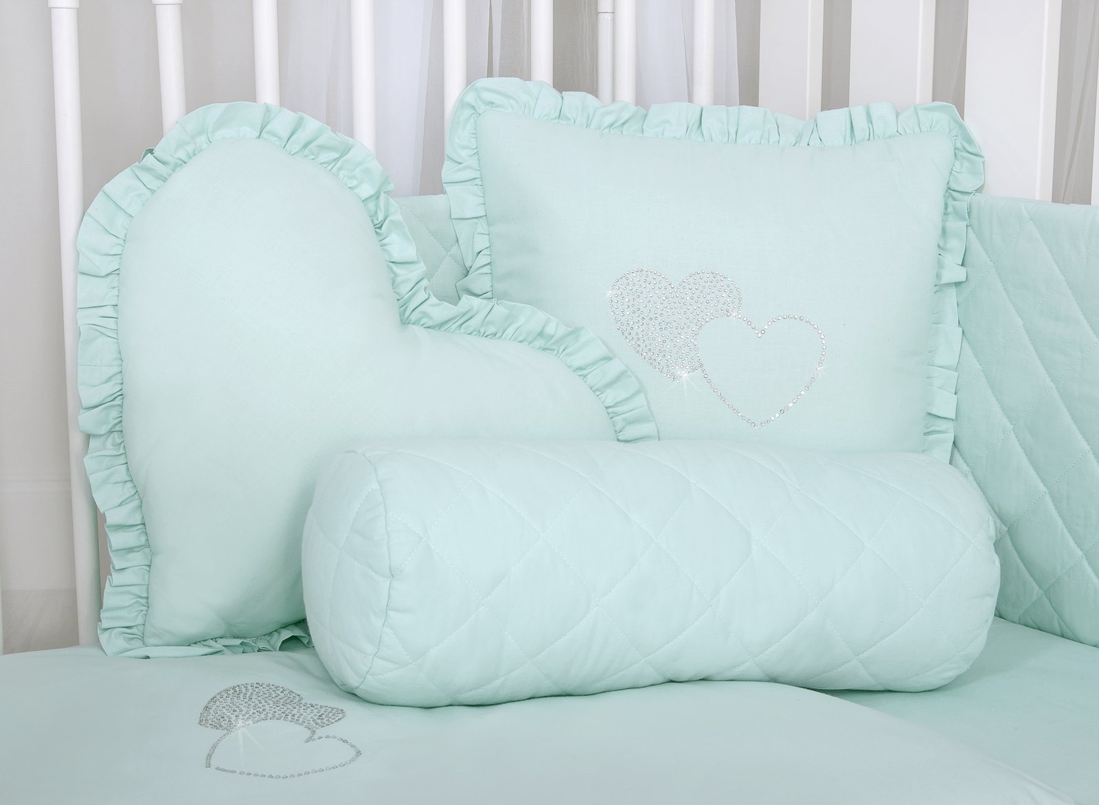 Elegant quilted pillow. Outer fabric made of certified quilted cotton (not demountable). The filling inside the pillow it is Eco Fillball- atested Silicone Balls – “artificial fluff” for pillows- filling ensures proper settlement of the baby and air circulation. It will work excellent as a decoration of the children’s room. The roller pillow is a whole- without a removable pillowcase. It is a beautiful set with our beddings.