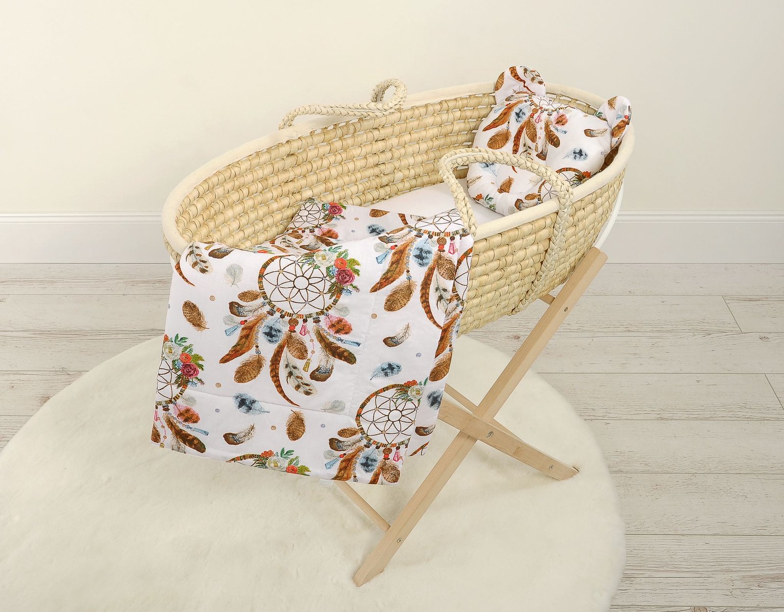 Baby bedding for pram gondola, Moses basket or cot. Made of durable 100% certified cotton. It is nice and pleasant to the touch. Does not irritate your baby’s delicate skin.