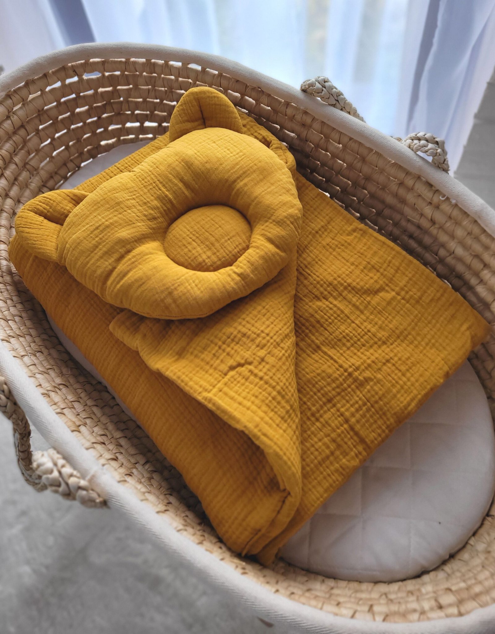 Beautiful 2-pcs Muslin bedding set (pillow and quilt) for stroller, moses basket, wicker crib or cradle. Not removable.
