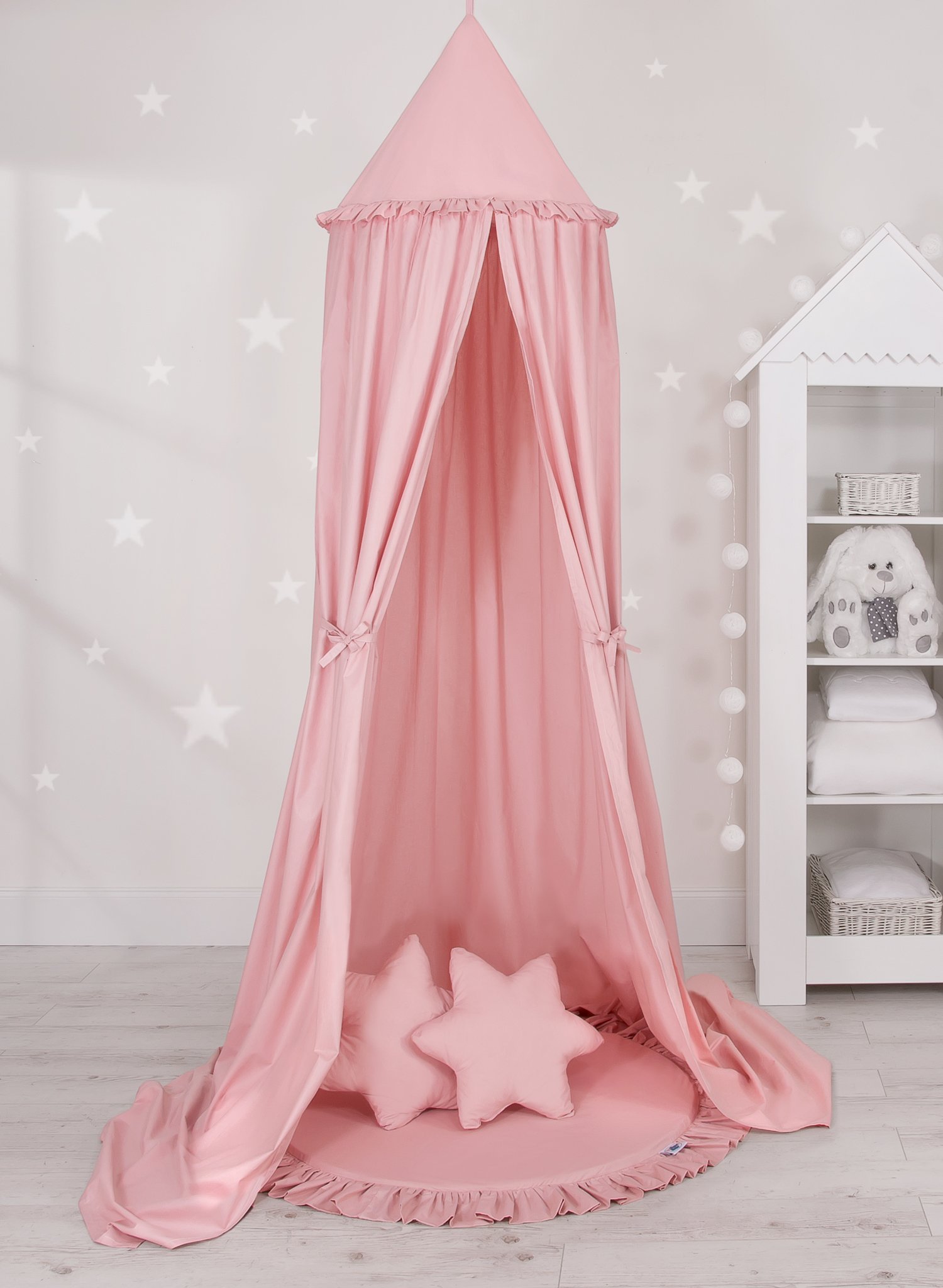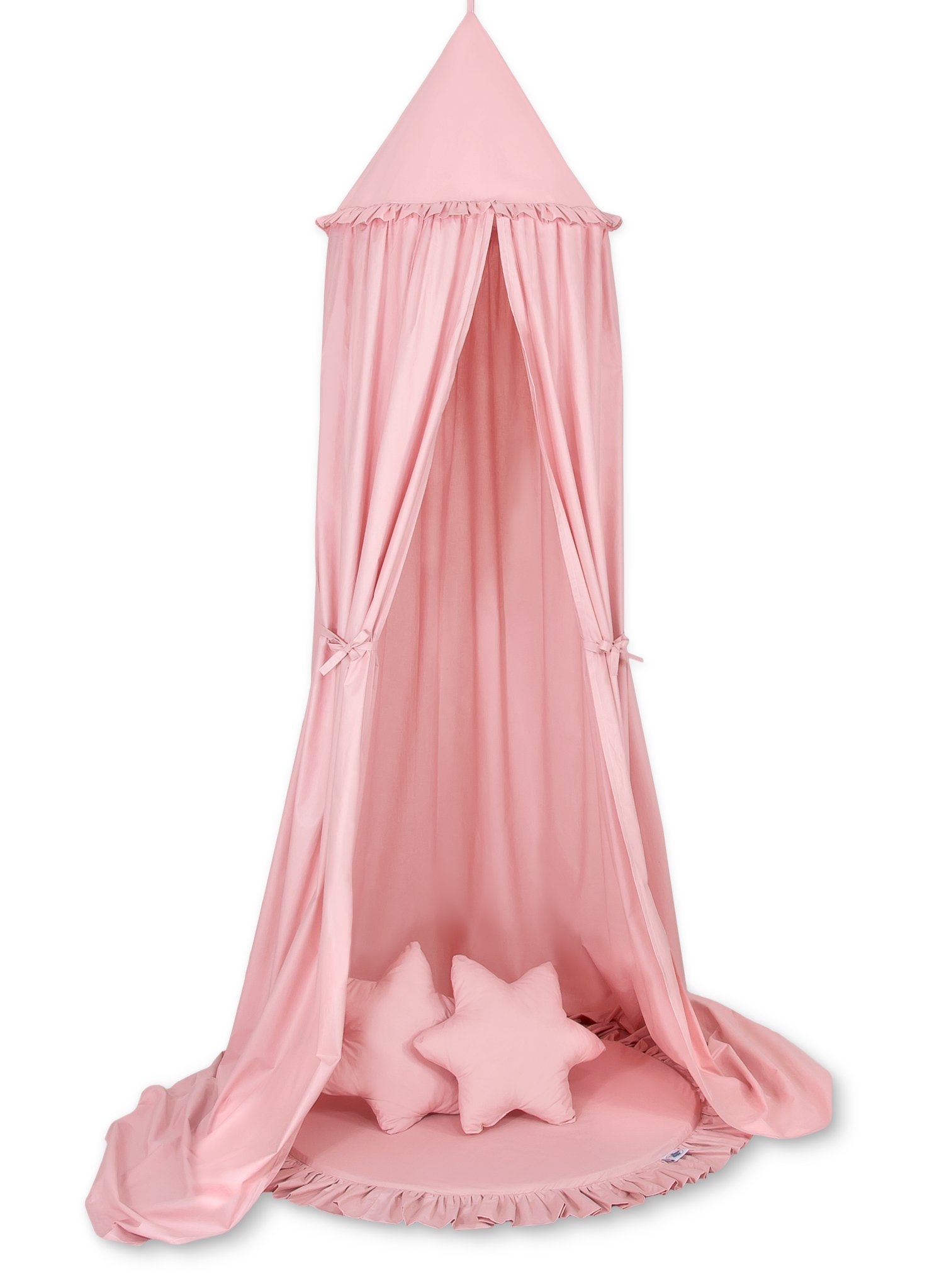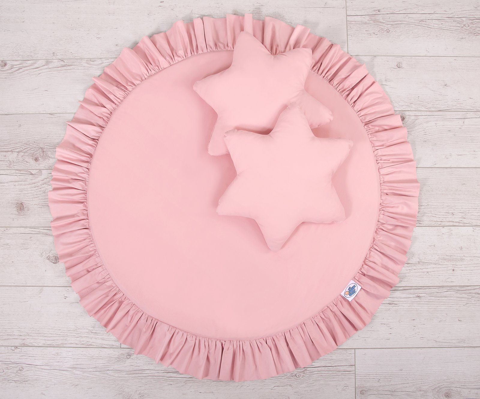 A floor play mat with ruffle. It can be used as a carpet,  play mat, or as a floor mat for the long canopy. From the first days of life can it be used as a place to rest or as a tummy time play mat. It has a soft filling that perfectly isolates from the hard and cold floor. The cover is made of OKOTEX certified 100% cotton.  The bottom of the play mat is made of a modern, anti-allergic, attested material. The bottom can be removed and the cover can be washed.