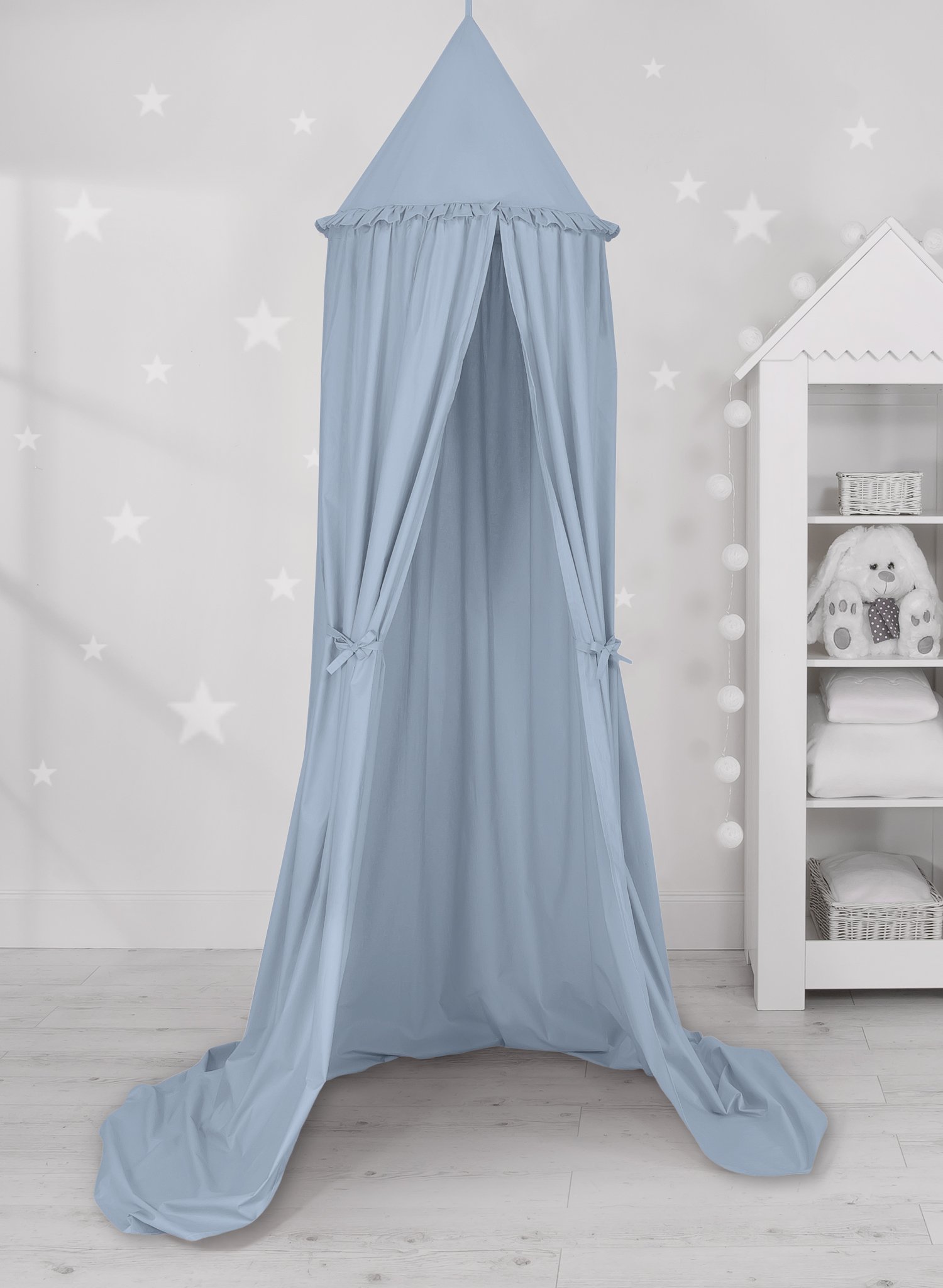 An effective long hanging canopy. A beautiful element it the children’s room. It can be used as a unique decoration of a baby cot, as well as it can create a wonderful  place to play. Hanging over the cot protect the canopy against too much light and noise creating a cozy  and safe place to rest inside the cot. The canopy can be easily mounted to the ceiling. The length of 260 cm allows to arrange the ends on the floor. This creates a perfect hiding place and playground for older children. The canopy is made of Okotex certificated, 100% cotton fabric. On the sides there are practical ribbons for tying the canopy and create a beautiful tent. The rim on the top can be removed. The fabric is washable by 30 Degrees.