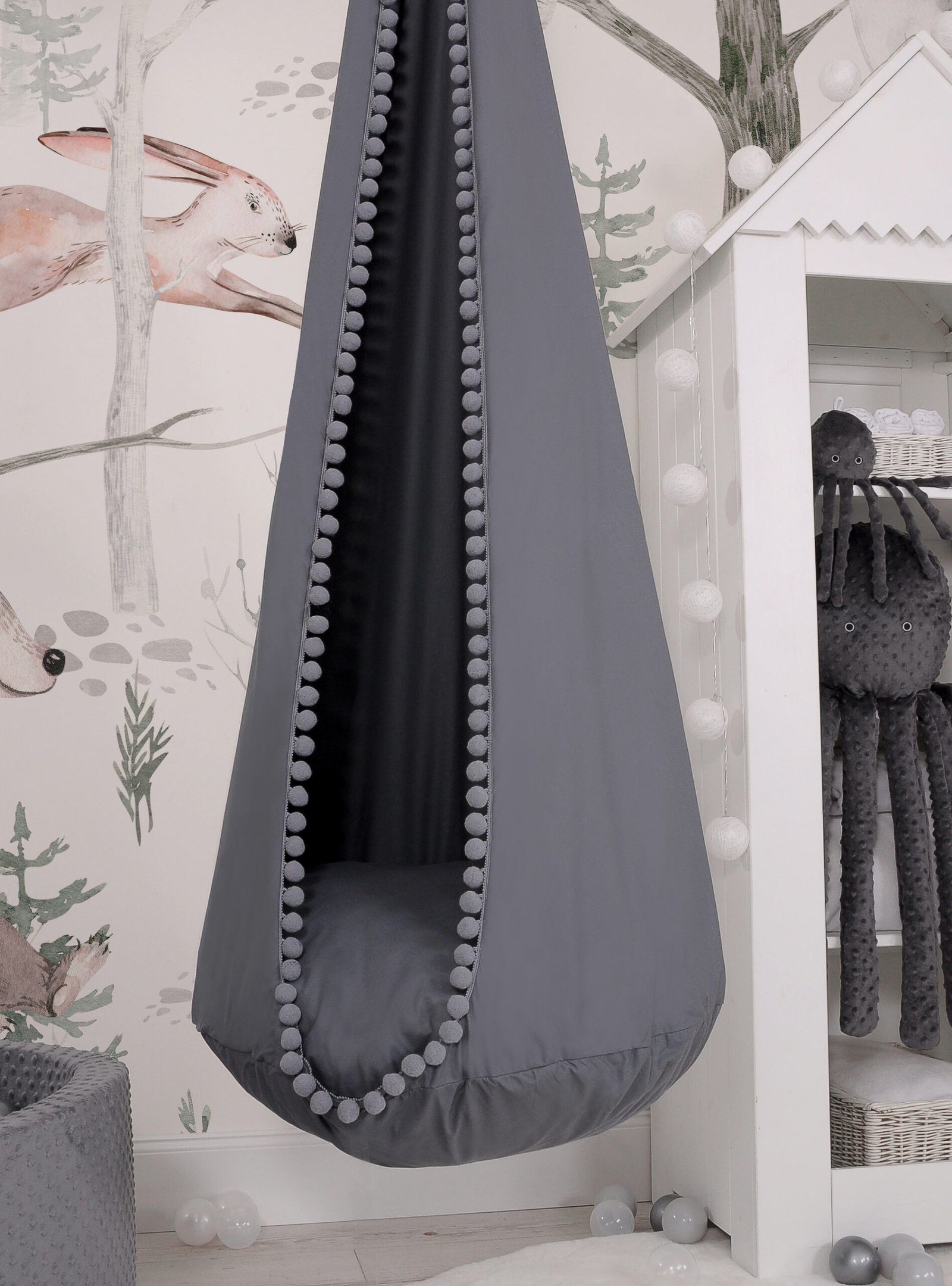 The swing has been made of high quality cotton. Two layers of fabric increase the stability and safety of the cocoon, strong straps strengthen the swing and careful handwork guarantees the highest quality. Cocoon decorated with decorative pompoms. Comes with a comfortable double sided cushion, removable for washing. Outer cover fastened with a covered zipper, easy to take off.