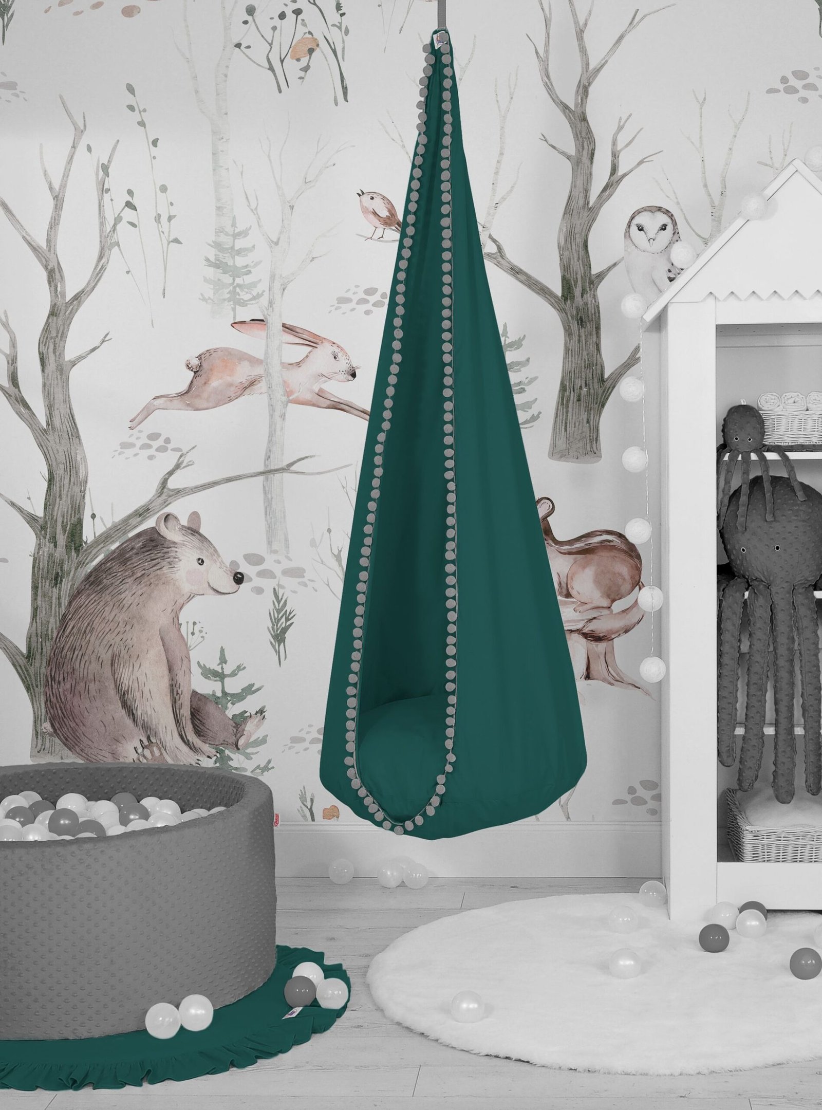 The swing has been made of high quality cotton. Two layers of fabric increase the stability and safety of the cocoon, strong straps strengthen the swing and careful handwork guarantees the highest quality. Cocoon decorated with decorative pompoms. Comes with a comfortable double sided cushion, removable for washing. Outer cover fastened with a covered zipper, easy to take off.