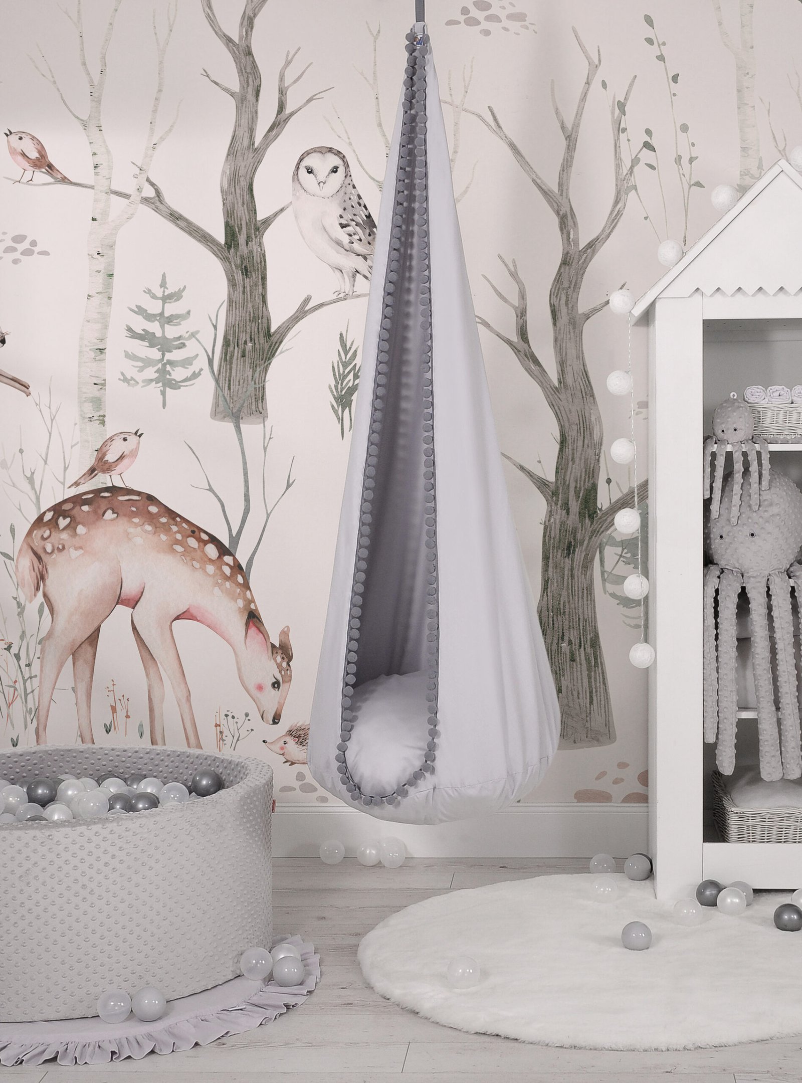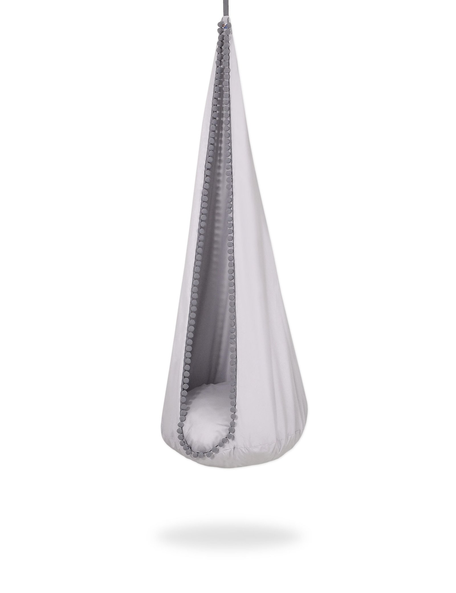 The swing has been made of high quality cotton. Two layers of fabric increase the stability and safety of the cocoon, strong straps strengthen the swing and careful handwork guarantees the highest quality. Cocoon decorated with decorative pompoms. Comes with a comfortable double sided cushion, removable for washing. Outer cover fastened with a covered zipper, easy to take off.