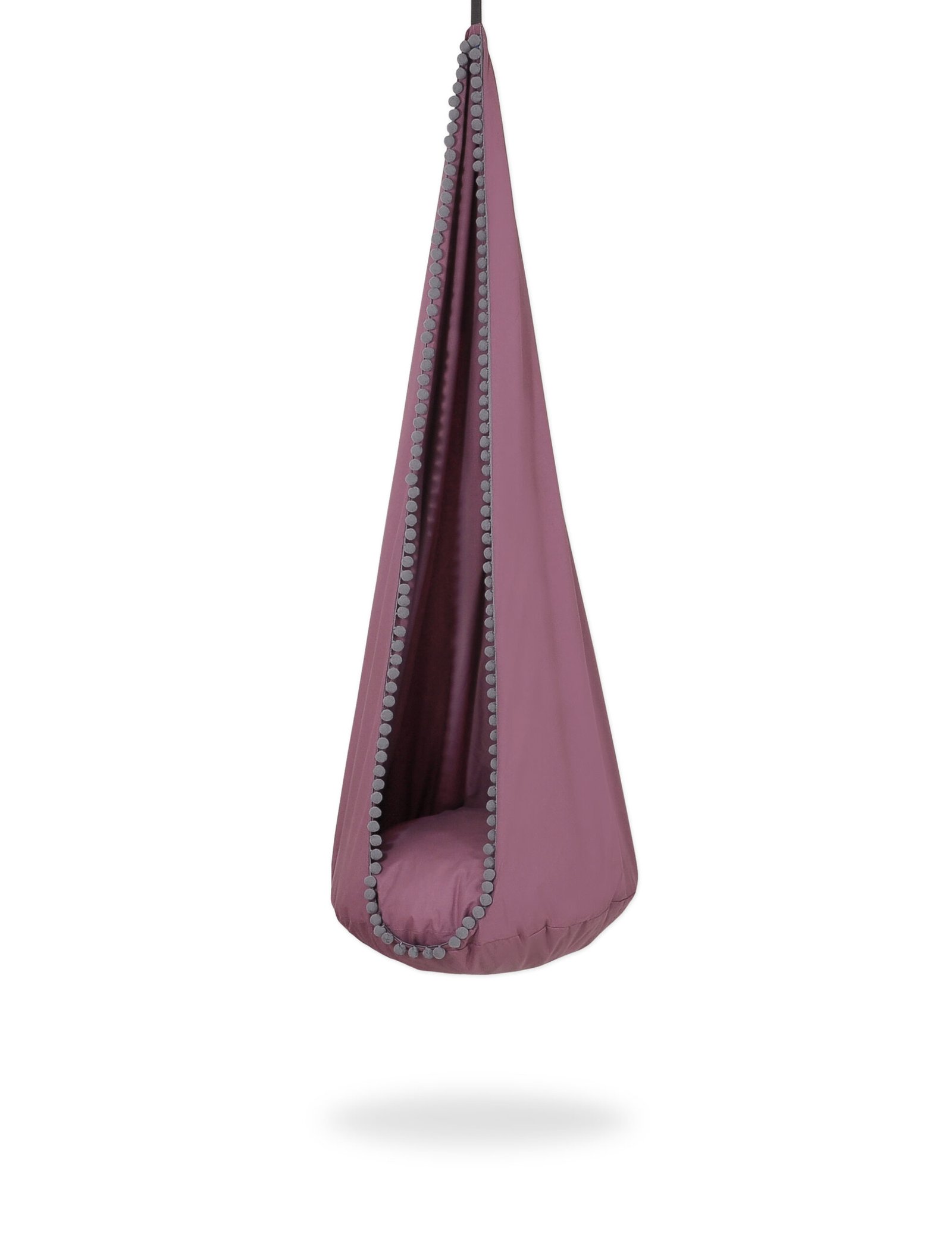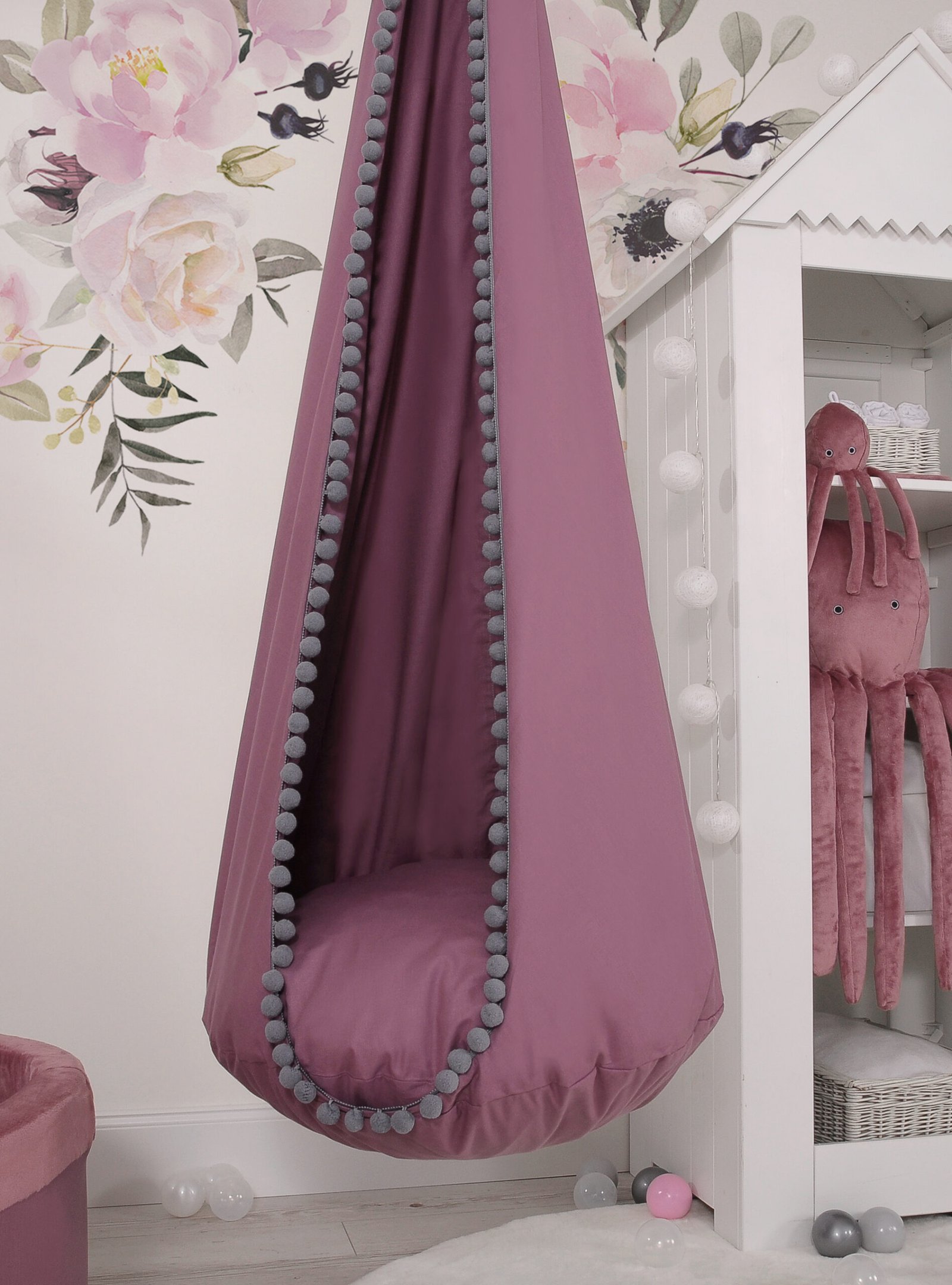 The swing has been made of high quality cotton. Two layers of fabric increase the stability and safety of the cocoon, strong straps strengthen the swing and careful handwork guarantees the highest quality. Cocoon decorated with decorative pompoms. Comes with a comfortable double sided cushion, removable for washing. Outer cover fastened with a covered zipper, easy to take off.