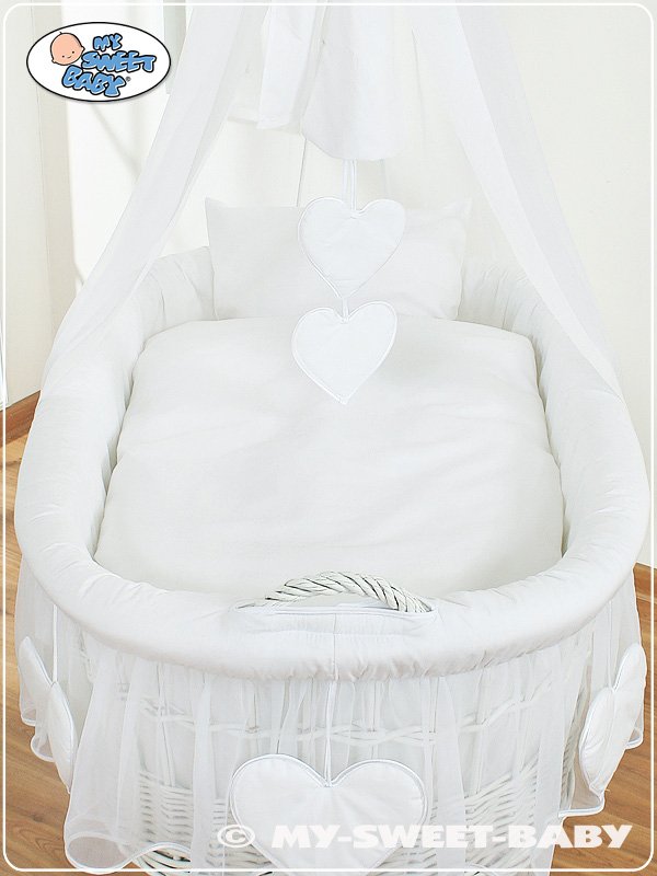 A beautiful basket. The biggest bassinet on the market. A white color of wicker and wood.