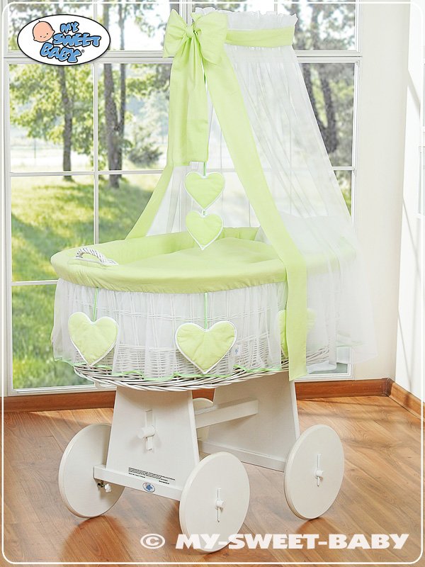 A beautiful basket. The biggest bassinet on the market. A white color of wicker and wood.