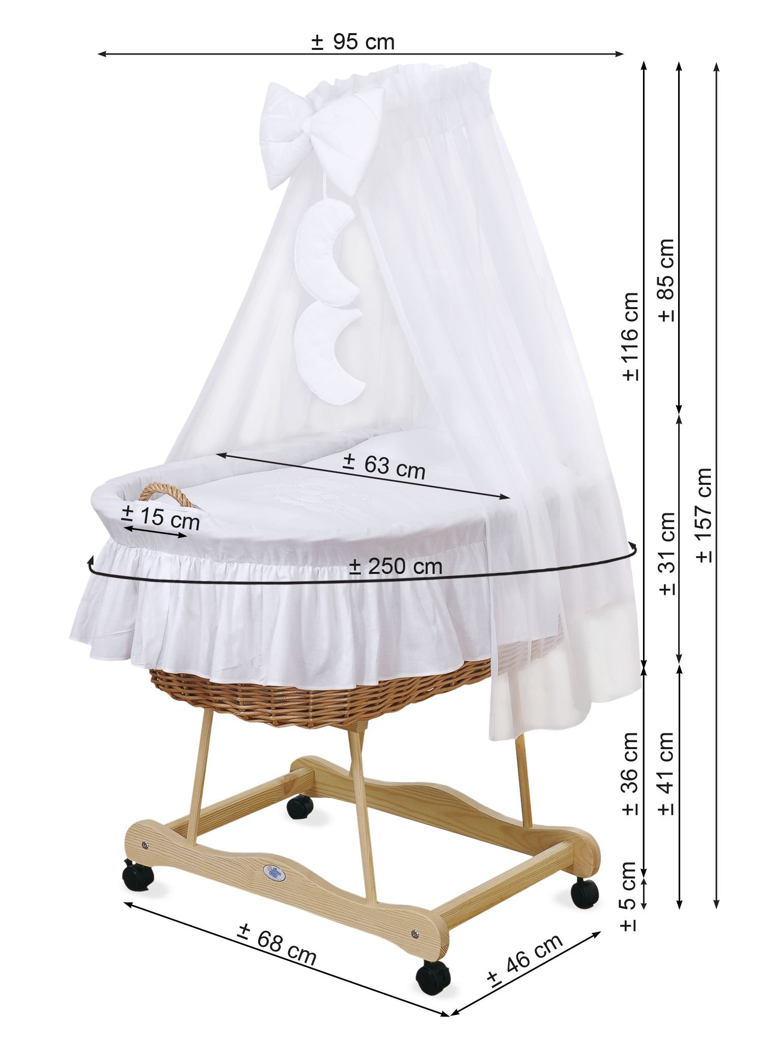 The biggest bassinet on the market with total sizing of L 95 cm, B 60 cm, H 140 cm. The biggest lying space: 80 x 45 cm allows to use the crib longer. Suitable from birth to 9 months approx.