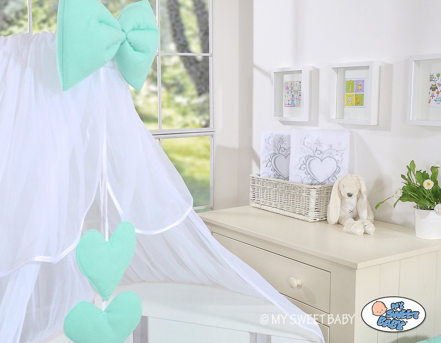 Mosquito net universally suitable for beds 140x70cm and 120x60cm. Suitable for all cots, looks very decorative.