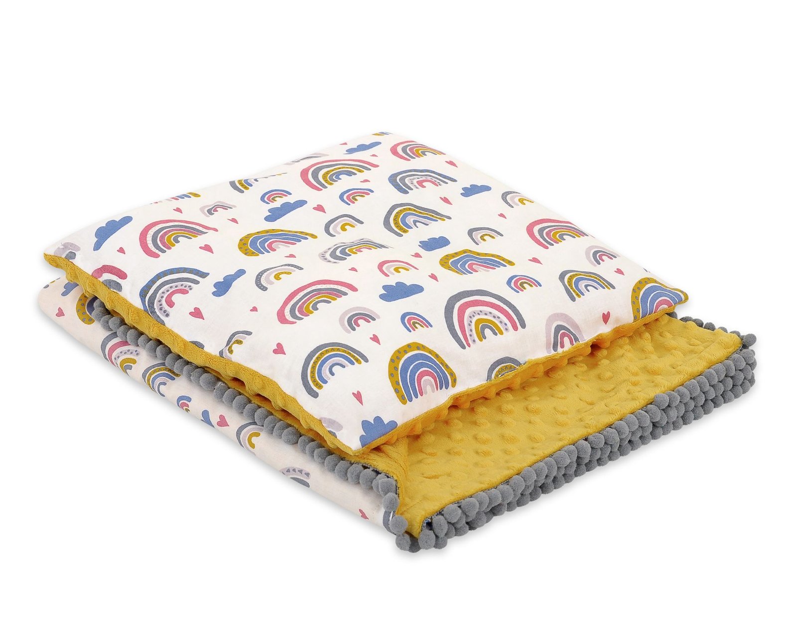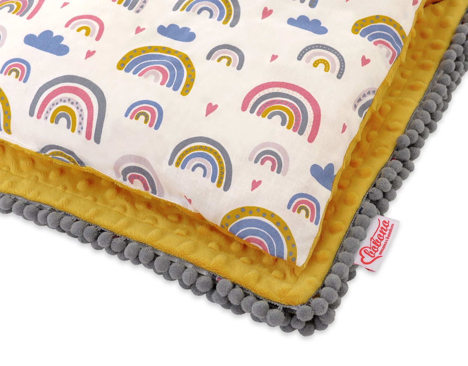 Baby set – double-sided blanket and cushion in minky and cotton, with colourful pompoms.