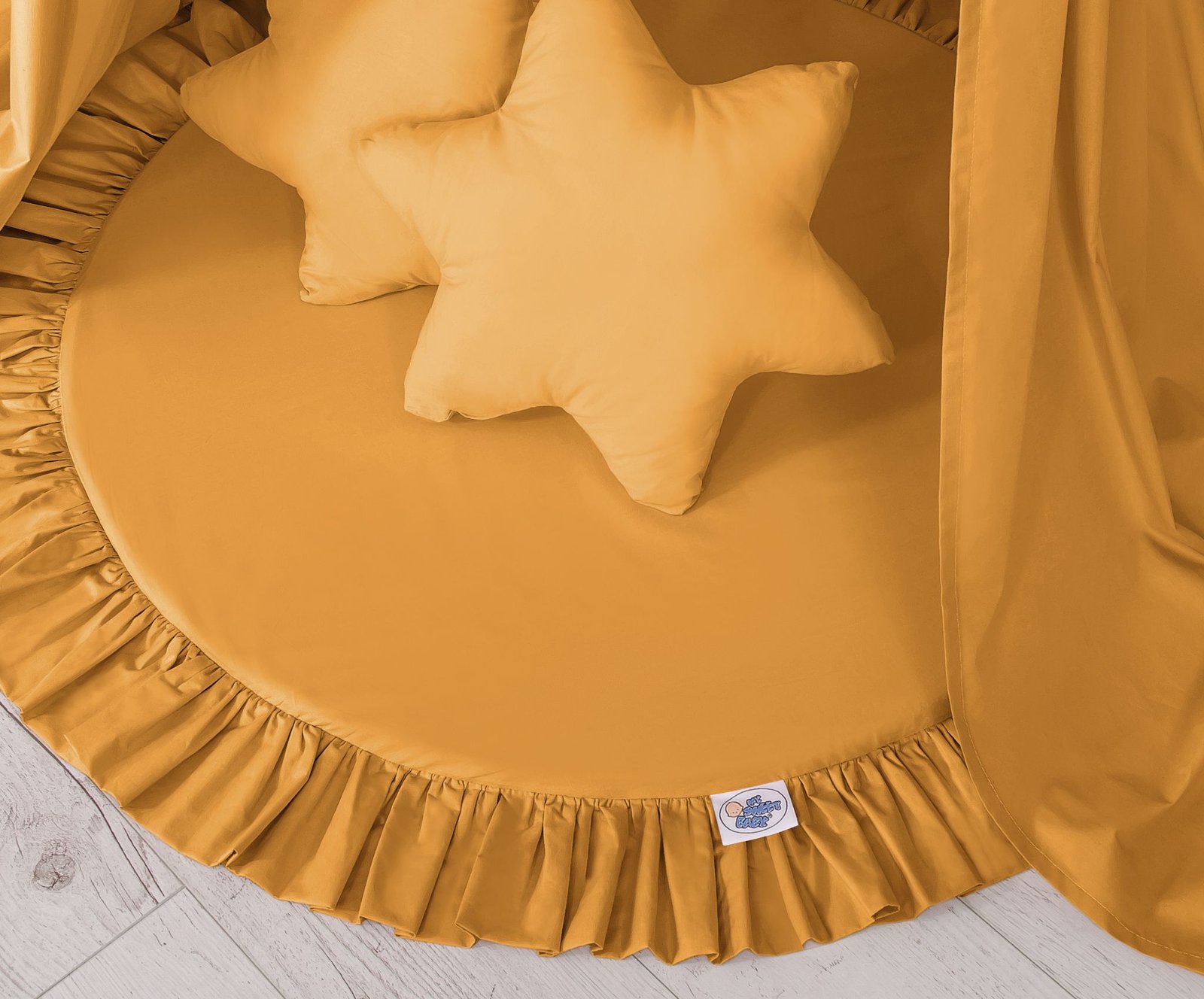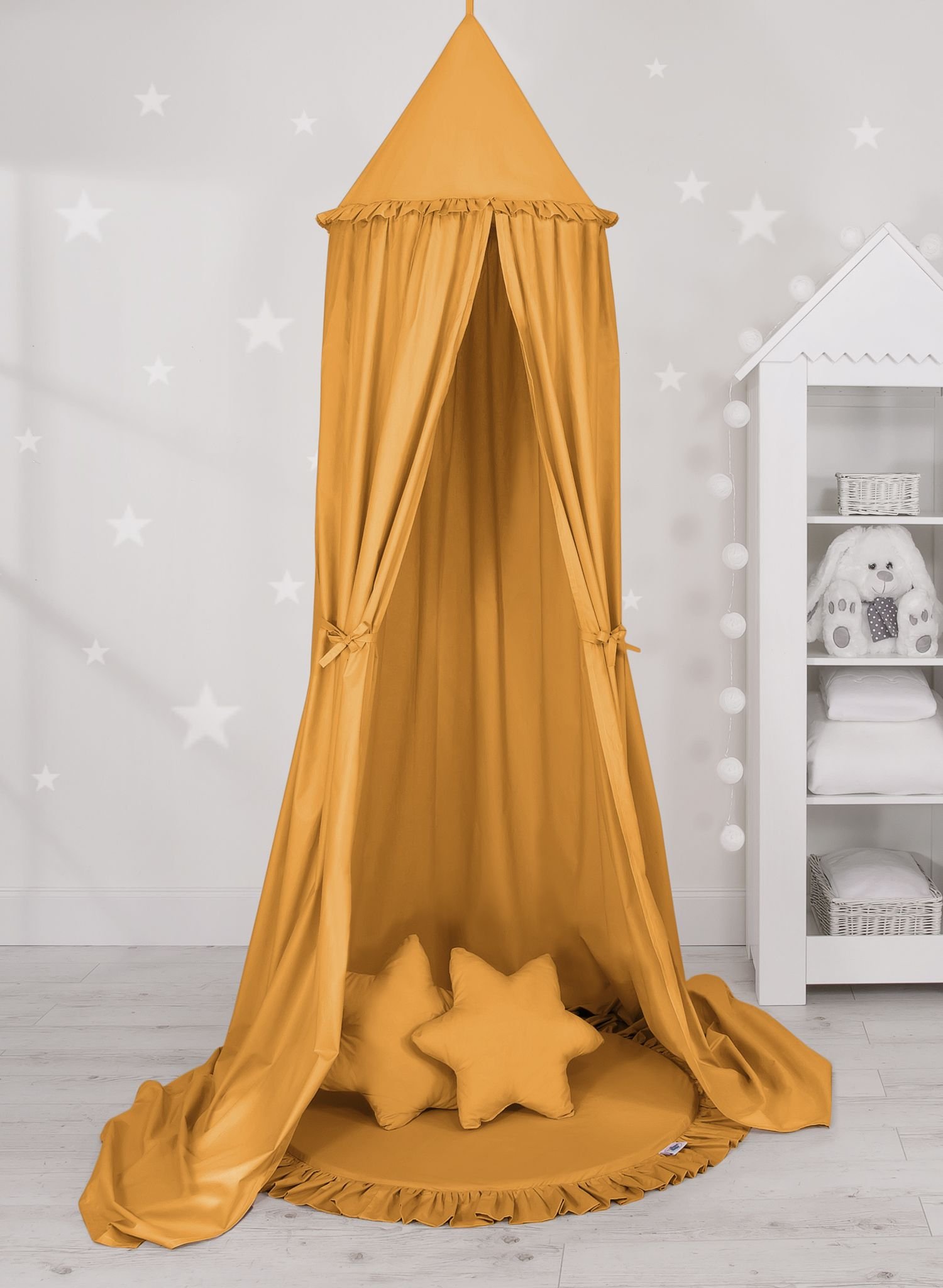 An effective long hanging canopy. A beautiful element it the children’s room. It can be used as a unique decoration of a baby cot, as well as it can create a wonderful place to play. Hanging over the cot protect the canopy against too much light and noise creating a cozy and safe place to rest inside the cot. The canopy can be easily mounted to the ceiling. The length of 260 cm allows to arrange the ends on the floor. This creates a perfect hiding place and playground for older children. The canopy is made of Okotex certificated, 100% cotton fabric. On the sides there are practical ribbons for tying the canopy and create a beautiful tent. The rim on the top can be removed. The fabric is washable by 30 Degrees. Combined with soft and comfy floor mat it will become a perfect place for fun. The mat has a soft filling that perfectly isolates from the hard and cold floor. The cover is made of OKOTEX certified 100% cotton. The bottom of the play mat is made of a modern, anti-allergic, attested material. The bottom can be removed and the cover can be washed.