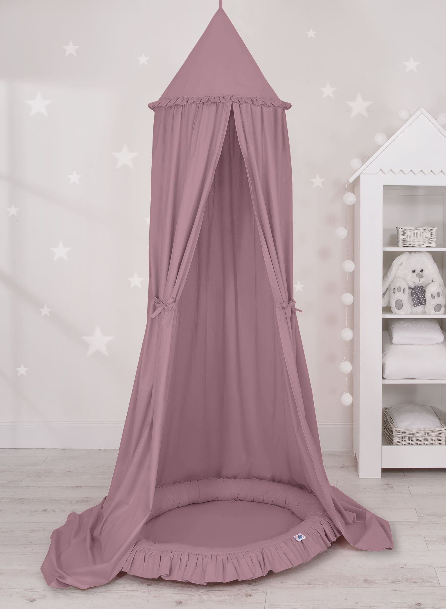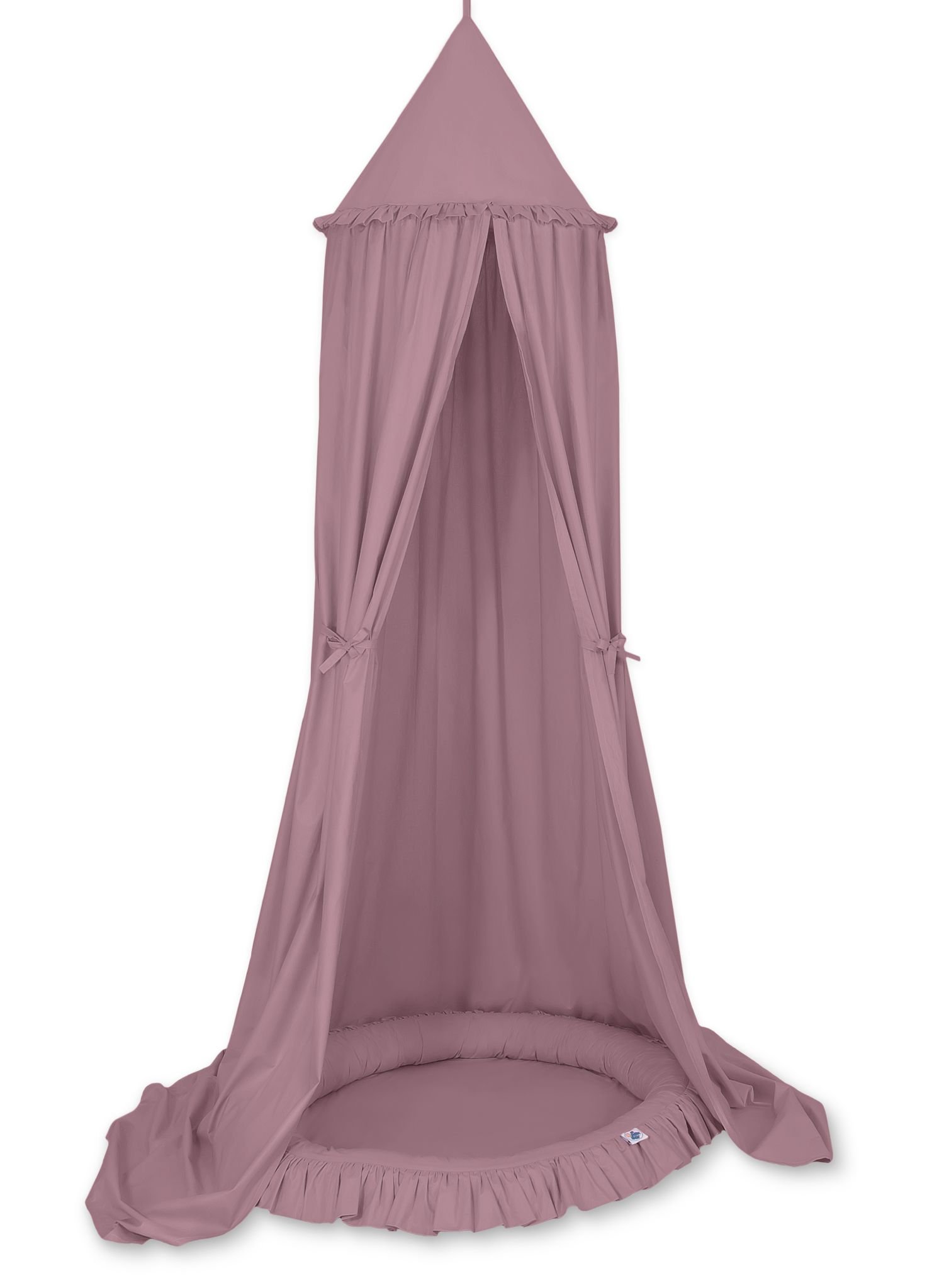 An effective long hanging canopy. A beautiful element it the children’s room. It can be used as a unique decoration of a baby cot, as well as it can create a wonderful  place to play. Hanging over the cot protect the canopy against too much light and noise creating a cozy  and safe place to rest inside the cot. The canopy can be easily mounted to the ceiling. The length of 260 cm allows to arrange the ends on the floor. This creates a perfect hiding place and playground for older children. The canopy is made of Okotex certificated, 100% cotton fabric. On the sides there are practical ribbons for tying the canopy and create a beautiful tent. The rim on the top can be removed. The fabric is washable by 30 Degrees. Combined with lovely nest with a flounce it will become a perfect place for fun. The soft edges provide safety for the babies. The edge is filled with approved, non-allergenic filling: Eco –Fillball fibers. They are soft, resilience and they assure the proper air circulation. The bottom of the baby nest with flounce is made of a modern, anti-allergenic, attested material. The bottom inlay can be removed and the cover can be washed at 30 degrees