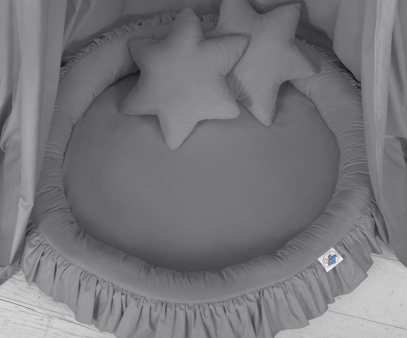 An effective long hanging canopy. A beautiful element it the children’s room. It can be used as a unique decoration of a baby cot, as well as it can create a wonderful  place to play. Hanging over the cot protect the canopy against too much light and noise creating a cozy  and safe place to rest inside the cot. The canopy can be easily mounted to the ceiling. The length of 260 cm allows to arrange the ends on the floor. This creates a perfect hiding place and playground for older children. The canopy is made of Okotex certificated, 100% cotton fabric. On the sides there are practical ribbons for tying the canopy and create a beautiful tent. The rim on the top can be removed. The fabric is washable by 30 Degrees. Combined with lovely nest with a flounce it will become a perfect place for fun. The soft edges provide safety for the babies. The edge is filled with approved, non-allergenic filling: Eco –Fillball fibers. They are soft, resilience and they assure the proper air circulation. The bottom of the baby nest with flounce is made of a modern, anti-allergenic, attested material. The bottom inlay can be removed and the cover can be washed at 30 degrees.