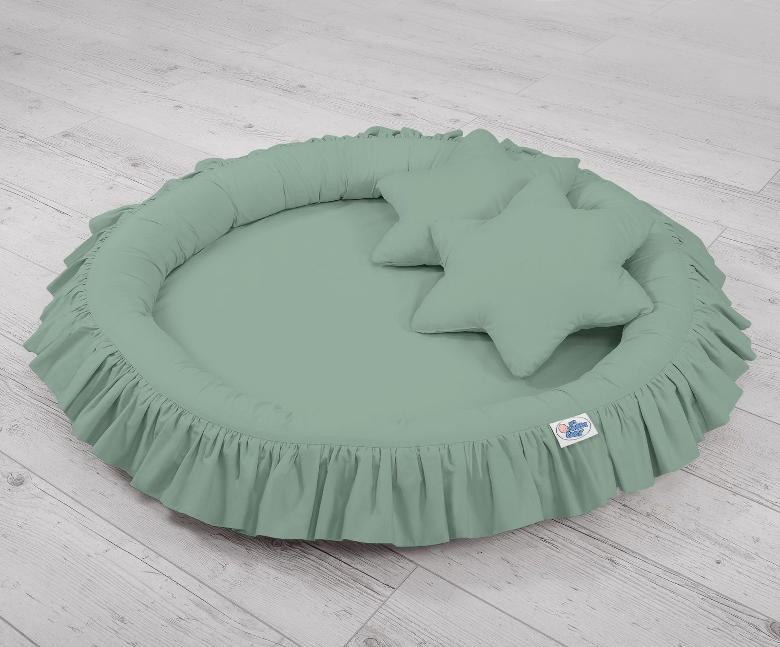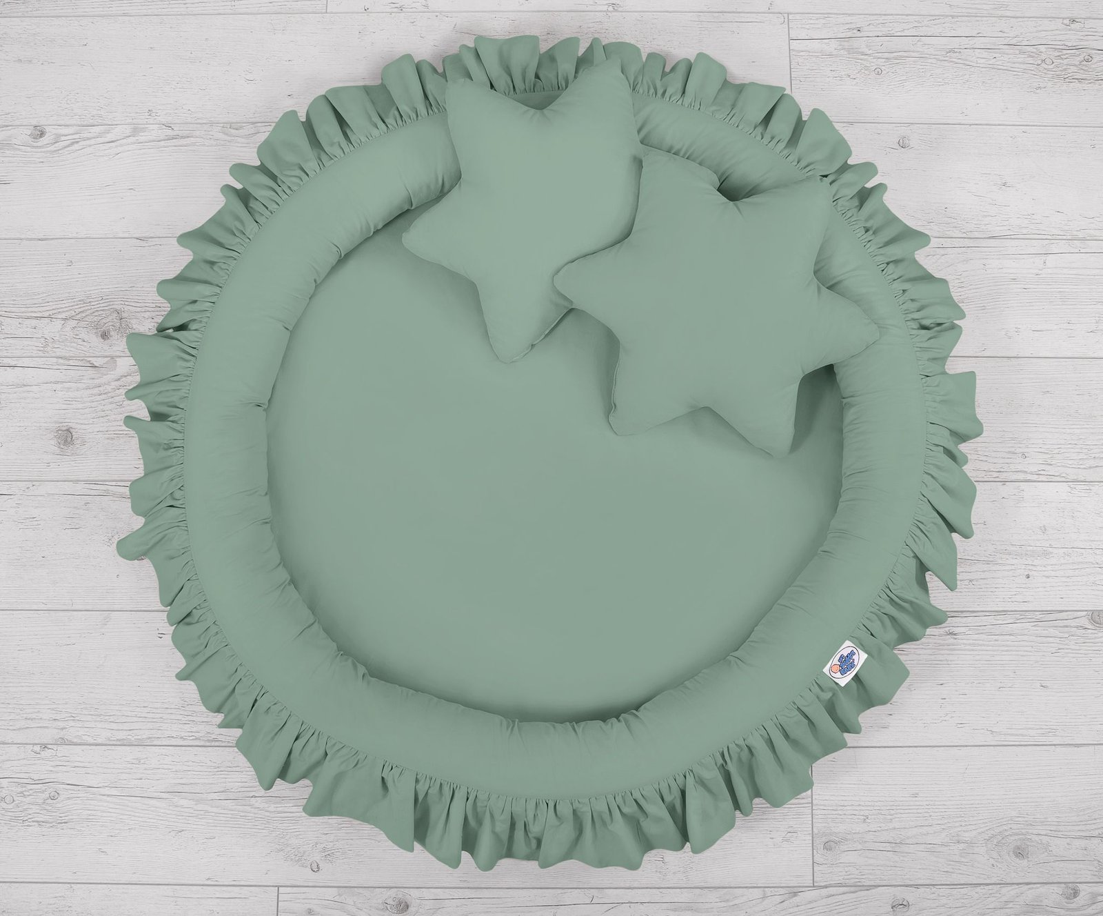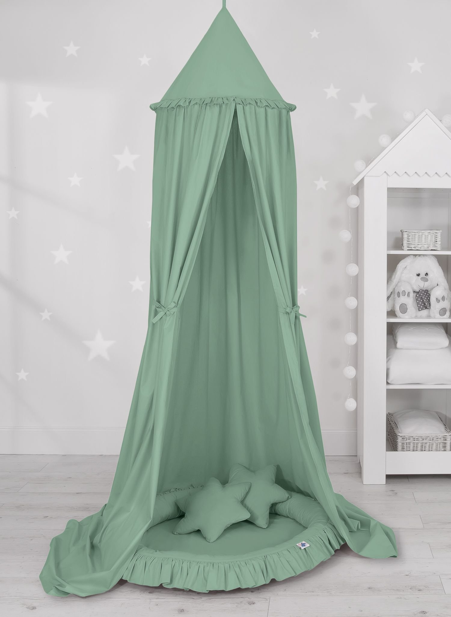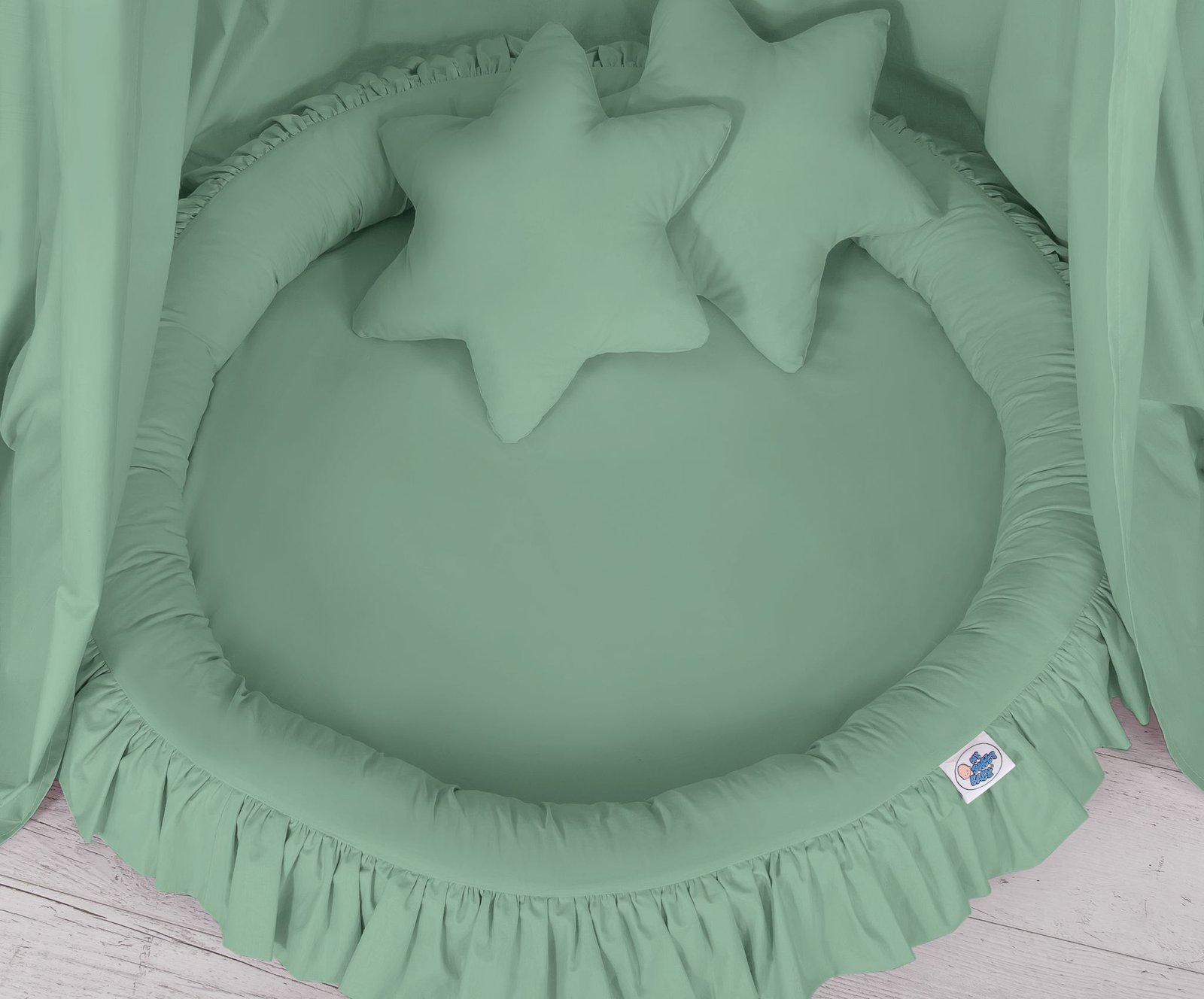 An effective long hanging canopy. A beautiful element it the children’s room. It can be used as a unique decoration of a baby cot, as well as it can create a wonderful place to play. Hanging over the cot protect the canopy against too much light and noise creating a cozy and safe place to rest inside the cot. The canopy can be easily mounted to the ceiling. The length of 260 cm allows to arrange the ends on the floor. This creates a perfect hiding place and playground for older children. The canopy is made of Okotex certificated, 100% cotton fabric. On the sides there are practical ribbons for tying the canopy and create a beautiful tent. The rim on the top can be removed. The fabric is washable by 30 Degrees. Combined with lovely nest with a flounce it will become a perfect place for fun. The soft edges provide safety for the babies. The edge is filled with approved, non-allergenic filling: Eco –Fillball fibers. They are soft, resilience and they assure the proper air circulation. The bottom of the baby nest with flounce is made of a modern, anti-allergenic, attested material. The bottom inlay can be removed and the cover can be washed at 30 degrees.