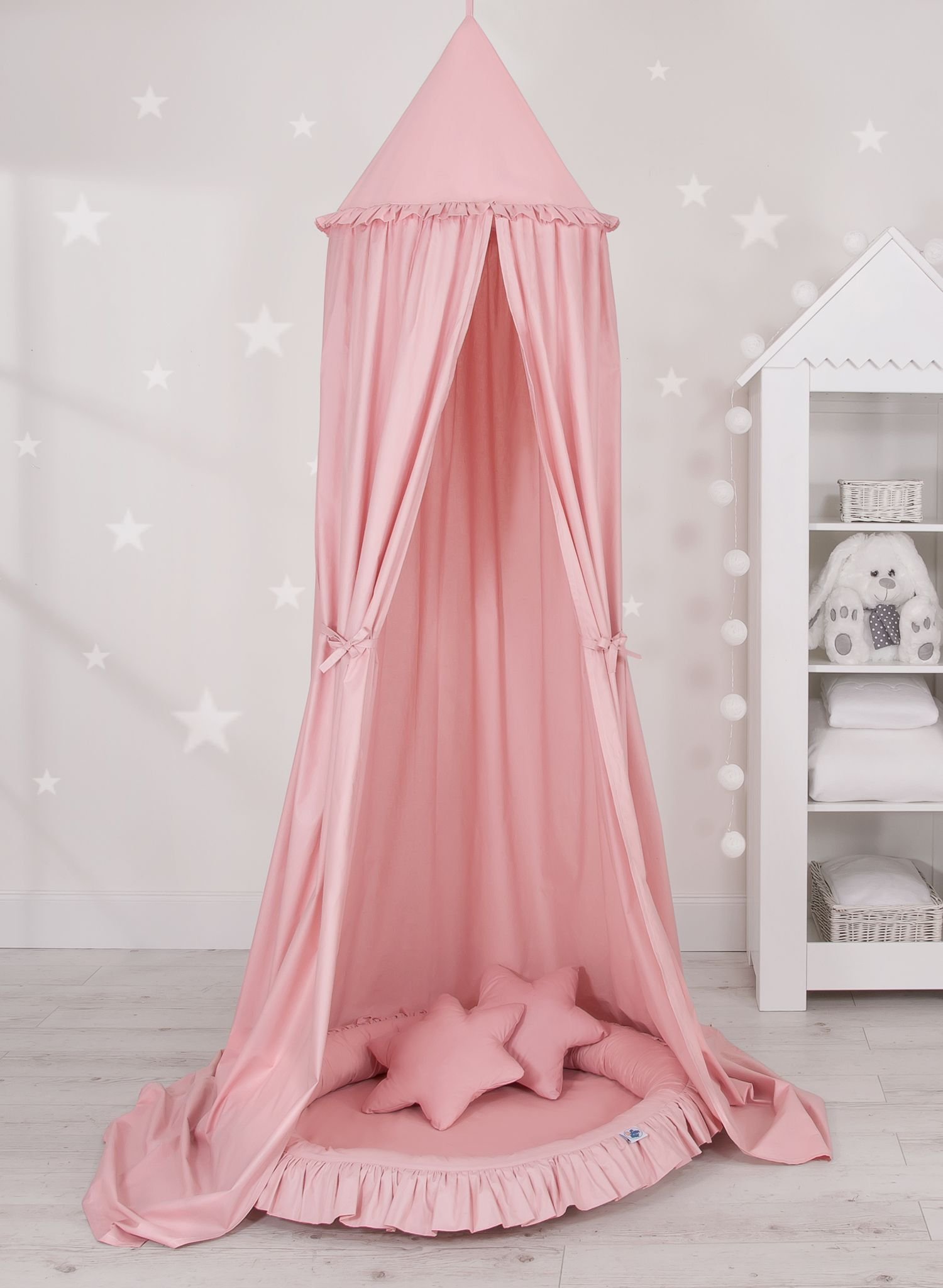 An effective long hanging canopy. A beautiful element it the children’s room. It can be used as a unique decoration of a baby cot, as well as it can create a wonderful  place to play. Hanging over the cot protect the canopy against too much light and noise creating a cozy  and safe place to rest inside the cot. The canopy can be easily mounted to the ceiling. The length of 260 cm allows to arrange the ends on the floor. This creates a perfect hiding place and playground for older children. The canopy is made of Okotex certificated, 100% cotton fabric. On the sides there are practical ribbons for tying the canopy and create a beautiful tent. The rim on the top can be removed. The fabric is washable by 30 Degrees. Combined with lovely nest with a flounce it will become a perfect place for fun. The soft edges provide safety for the babies. The edge is filled with approved, non-allergenic filling: Eco –Fillball fibers. They are soft, resilience and they assure the proper air circulation. The bottom of the baby nest with flounce is made of a modern, anti-allergenic, attested material. The bottom inlay can be removed and the cover can be washed at 30 degrees.