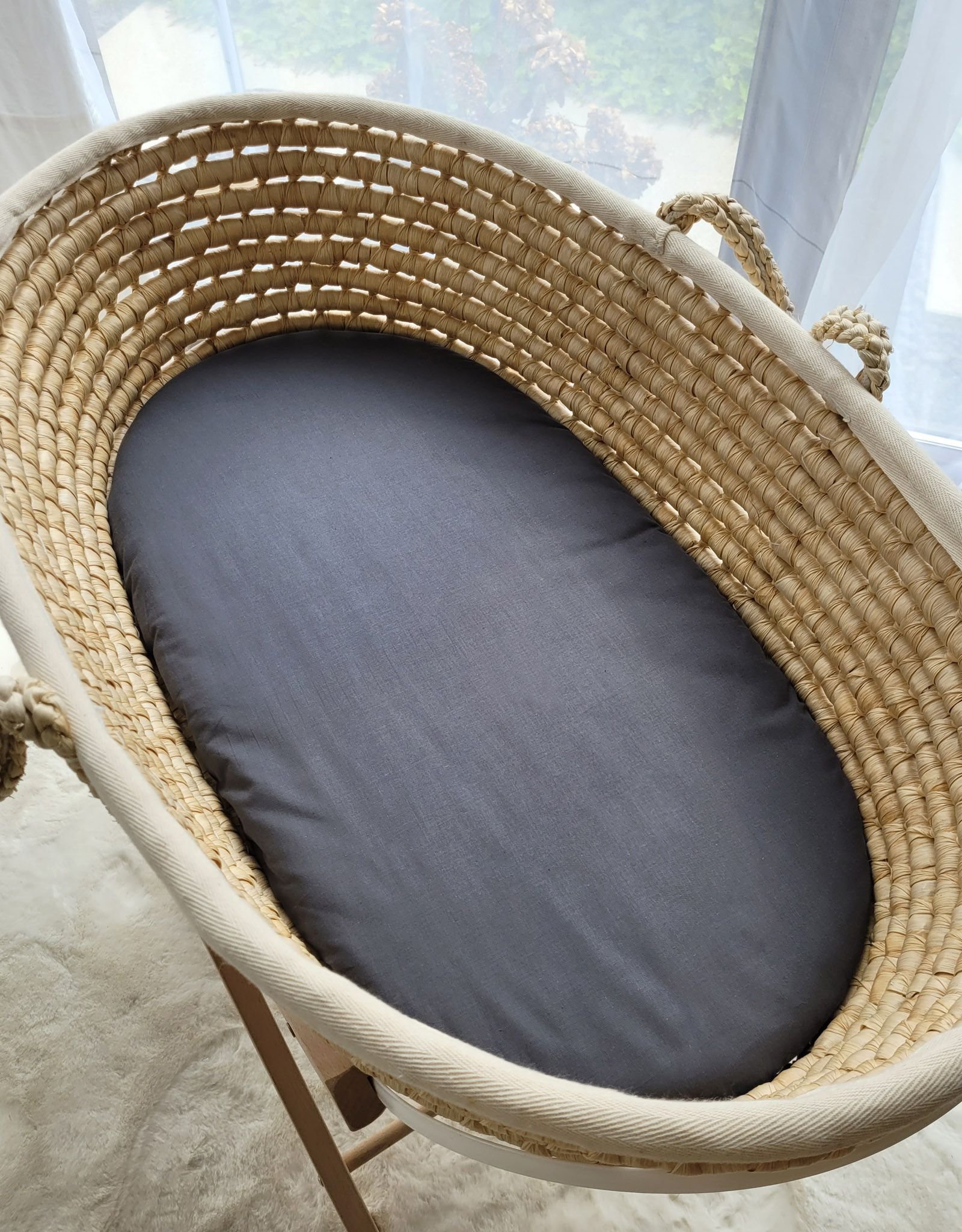 The cotton sheet fits Moses Boho baskets, Moses corn husk baskets and most pram gondola mattresses. Suggested mattress size: 75×35 cm, thickness 3 cm.