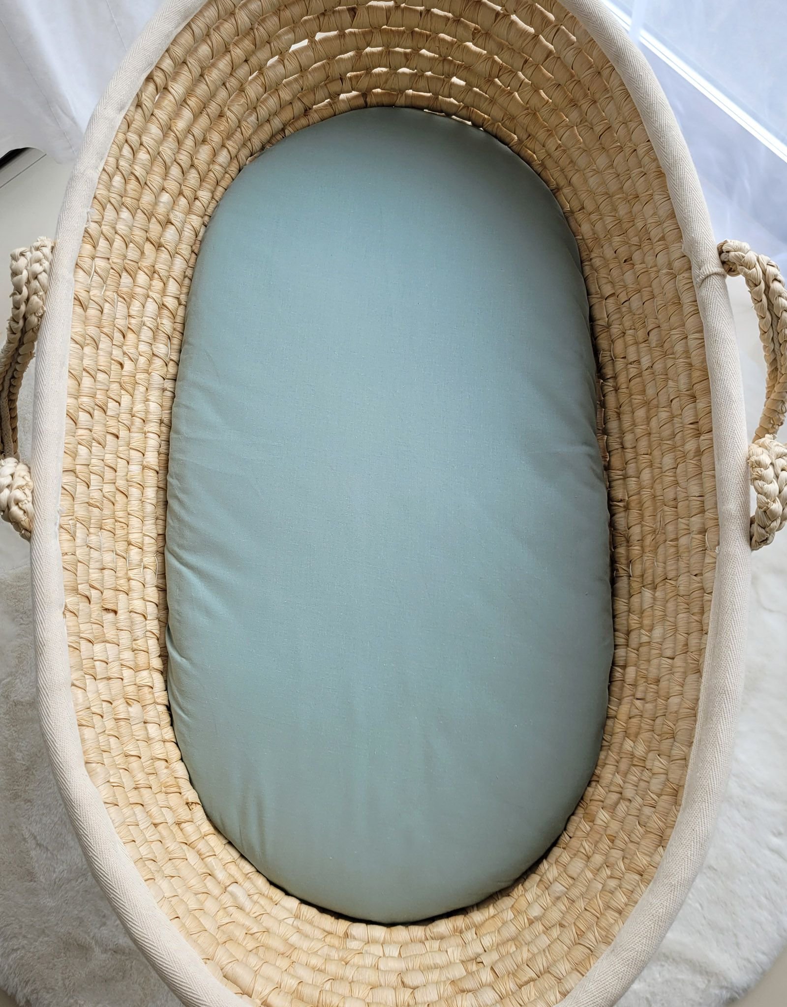The cotton sheet fits Moses Boho baskets, Moses corn husk baskets and most pram gondola mattresses. Suggested mattress size: 75×35 cm, thickness 3 cm.