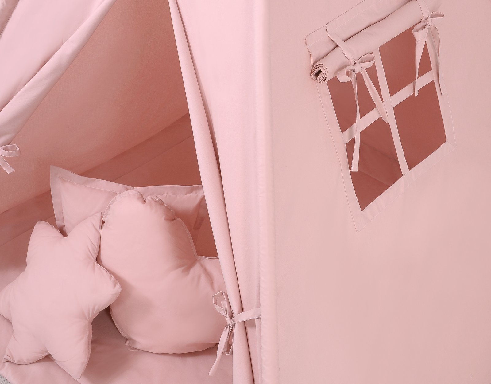 Thanks to its special design, the tent folds up easily and is very lightweight, making it easy to carry and set up anywhere. It has been made with attention to every detail so that it is safe and stable during play. The poles that build the tepee have been hidden in special tunnels – they are tied together at the top with a fastening string and finished with a special plastic cap at the bottom. The total height to which the tent unfolds is 150cm. The diameter of the lower part of the Tipi is approx. 130cm. The tent cover is removable and machine washable. There is a window with a curtain in the side wall of the tent, and the entrance to the tent has special ties that can be tied so that the child has a free passage into the tent and out. Once the curtains at the entrance have been lowered, the tent can provide an ideal hiding place during playtime.