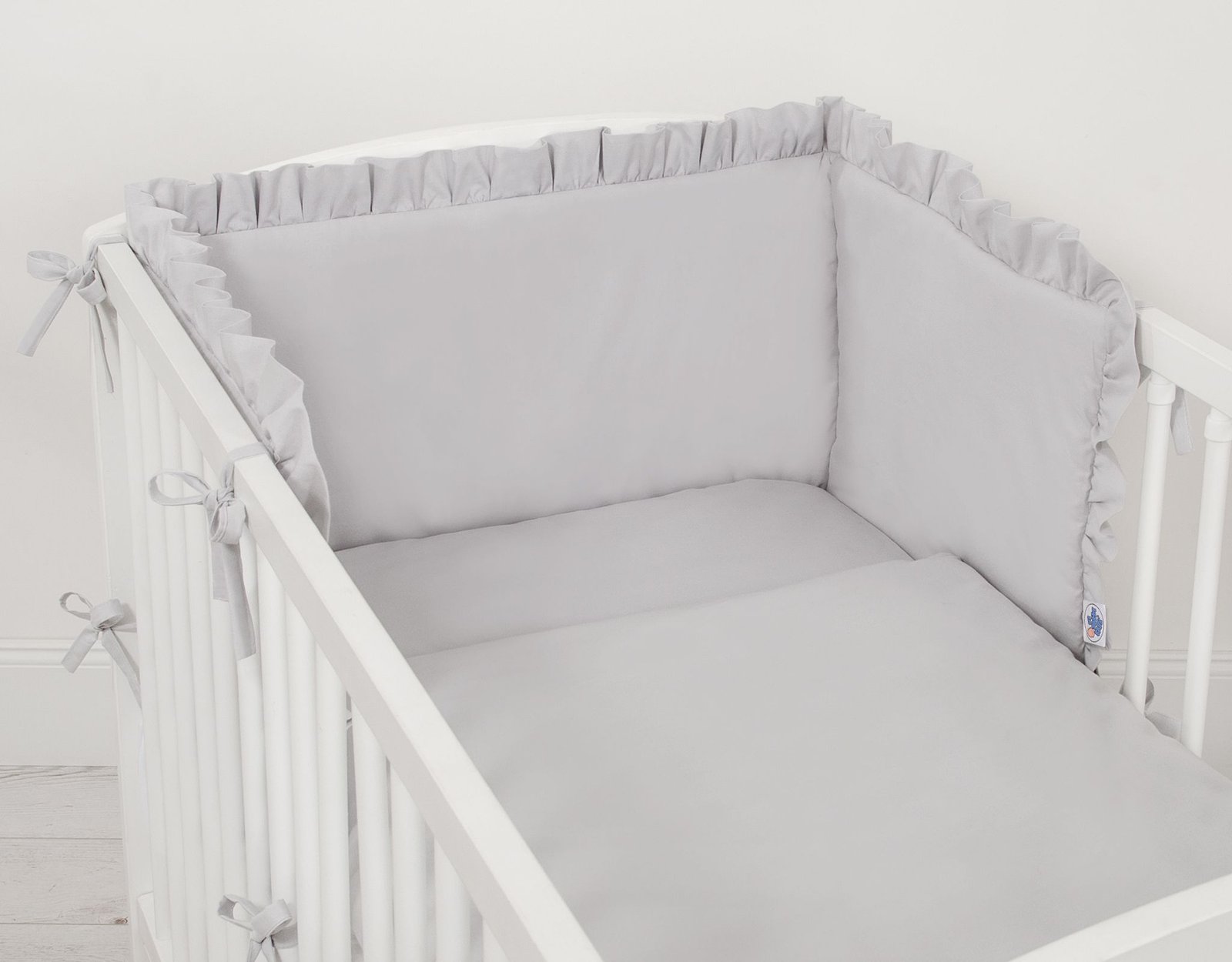 High and elastic bumper pad with decorative frill perfectly cushions and protects your baby from hard cot bars. Specially constructed with additional stitching, so that it fits both the 120×60 cm cot and the bigger 140×70 cm cot. The bumper is filled with a layer of soft, anti-allergenic silicone unwoven fabric of specially selected weight. No optical brighteners are used, it is a first class fibre. The non-woven fabric has the Ökotex certificate. The cot bumper is made of the highest quality cotton, which does not wash, “does not crumple” and does not lose its properties even after many washings. Cotton strong straps allow you to easily and firmly attach the bumper pad to the baby’s cot.