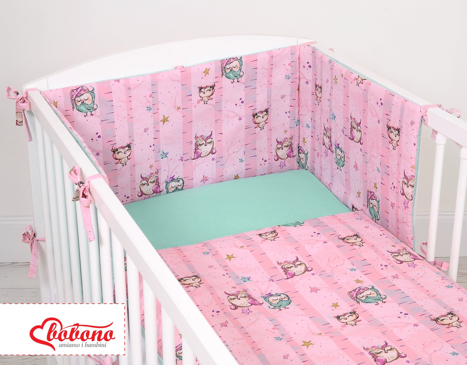 Universal bumper for cot – owls pink-mint