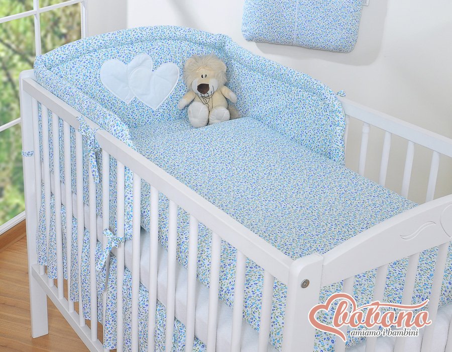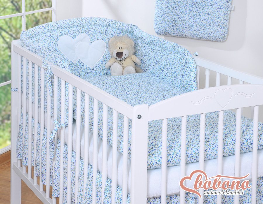 Dimensions: length 188 cm, height 35 cm. Specially designed with additional stitching. Perfectly fit for both size of cots: 60x120cm and 70x140cm. High headboard slightly rounded with decorative hearts, beautifully trimmed with satin piping. Specially trimmed, reinforced and thickened upper edge for greater softness and greater security in the cot.