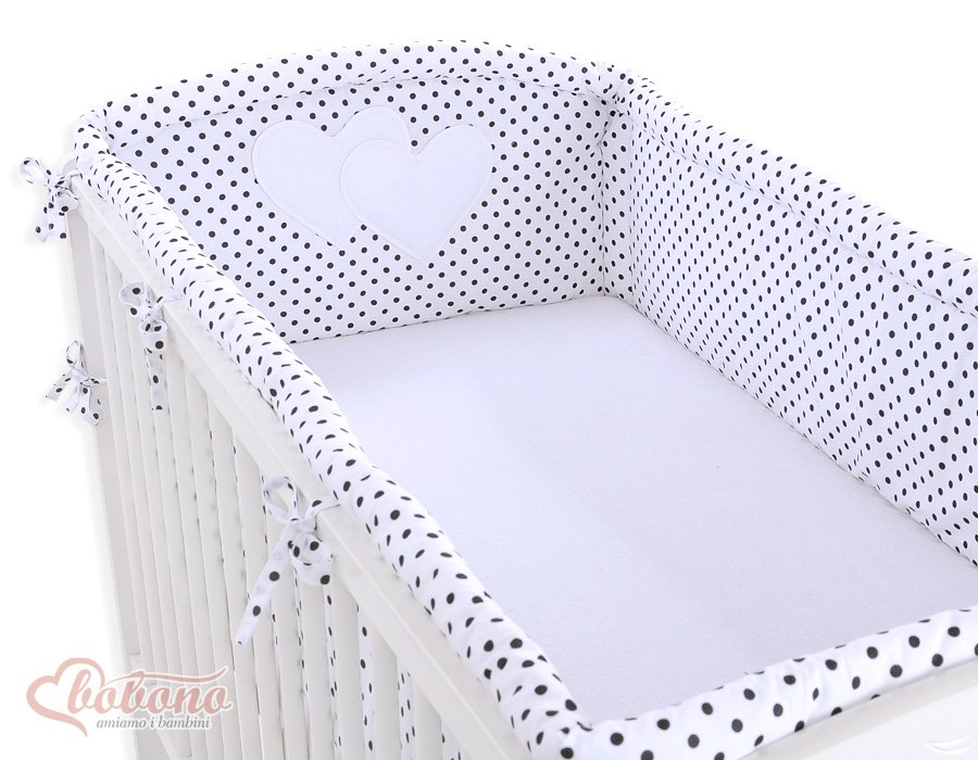 Dimensions: L-360cm, H- 35cm/ L-60cm, H-28cm. Specially designed, with additional stitching. Perfectly fit for both size of cots: 60x120cm and 70x140cm. High headboard slightly rounded with decorative hearts, beautifully trimmed with satin piping. Specially trimmed, reinforced and thickened upper edge for greater softness and greater security in the cot.