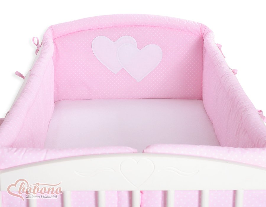 Dimensions: L-360cm, H- 35cm/ L-60cm, H-28cm. Specially designed, with additional stitching. Perfectly fit for both size of cots: 60x120cm and 70x140cm. High headboard slightly rounded with decorative hearts, beautifully trimmed with satin piping. Specially trimmed, reinforced and thickened upper edge for greater softness and greater security in the cot.