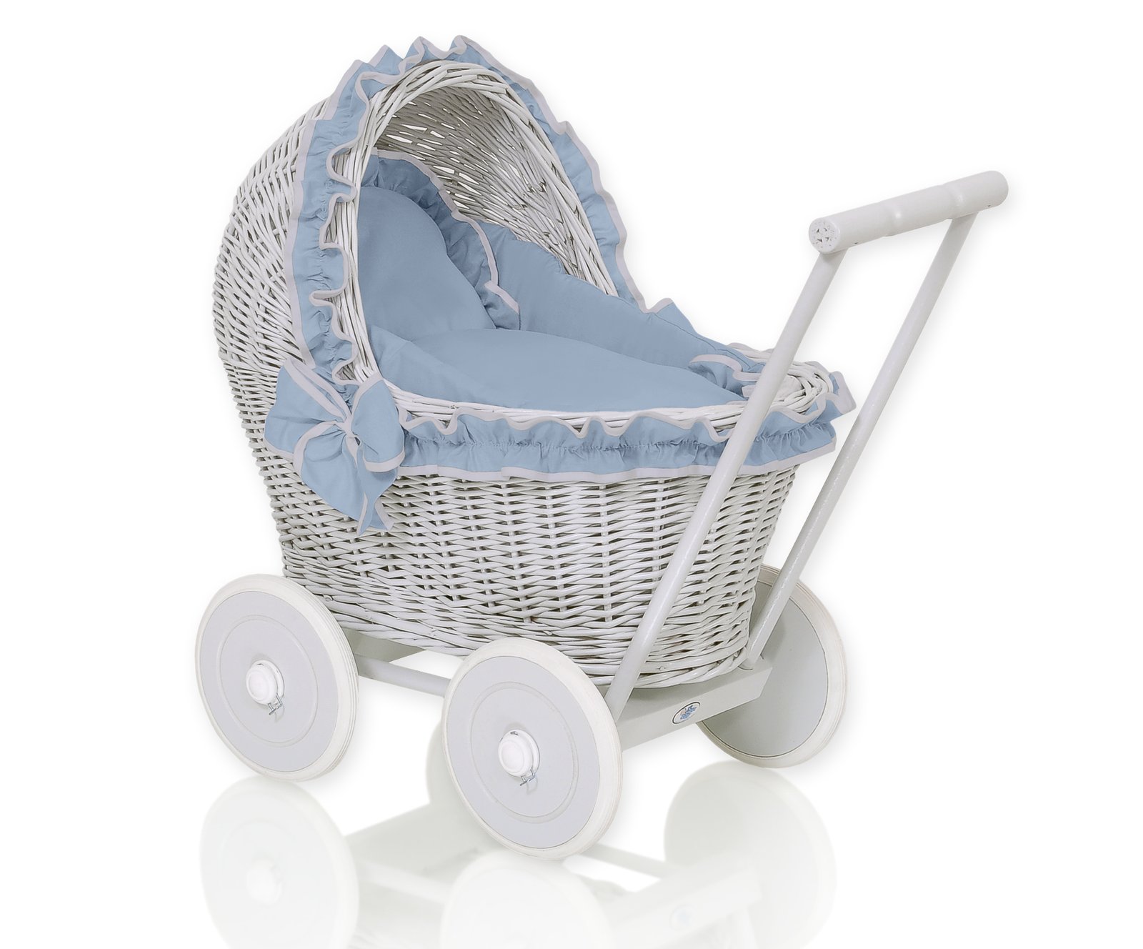 Wicker doll pushchair grey with pastel blue bedding and soft padding