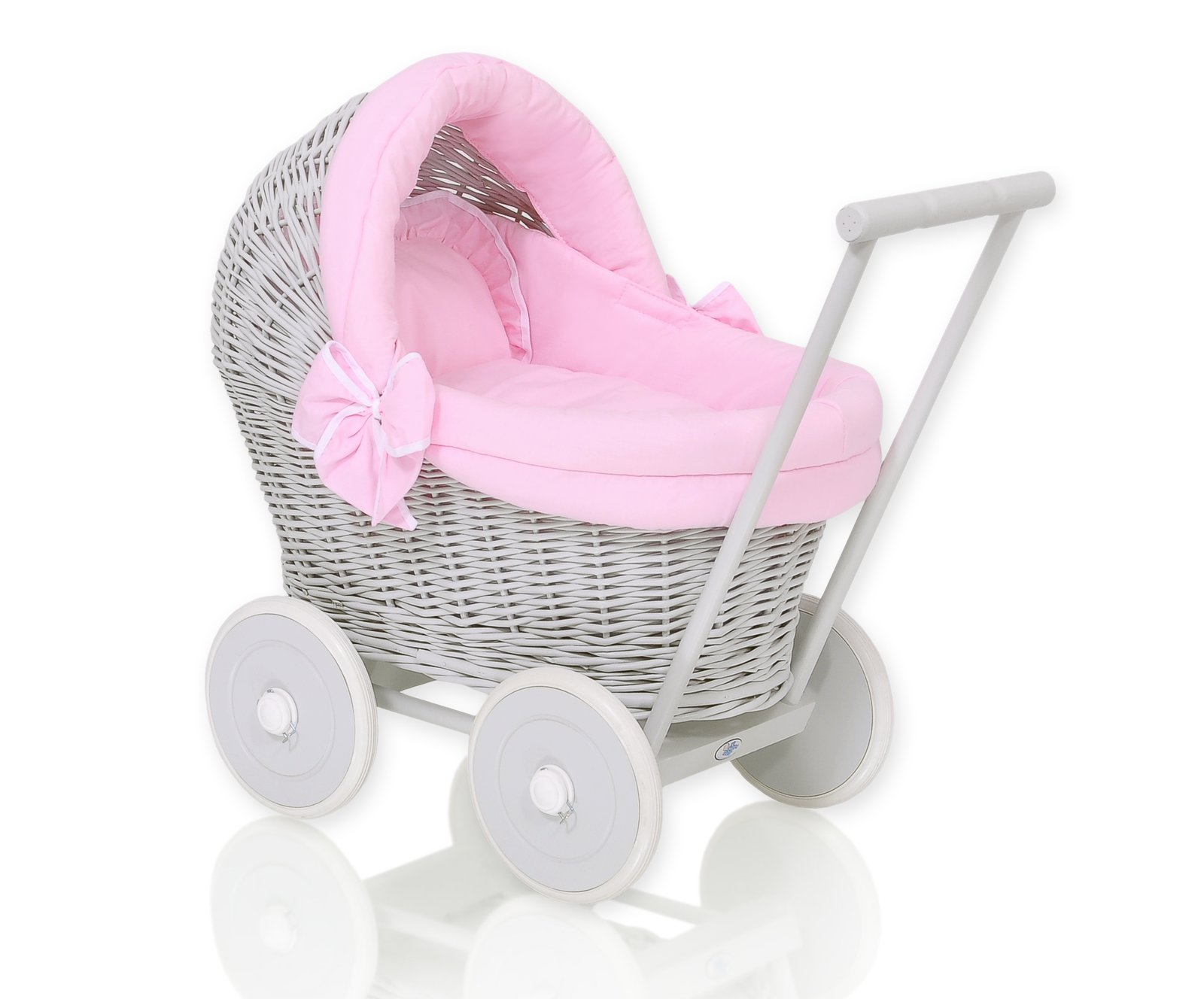 Wicker doll pushchair grey with pink bedding and soft padding
