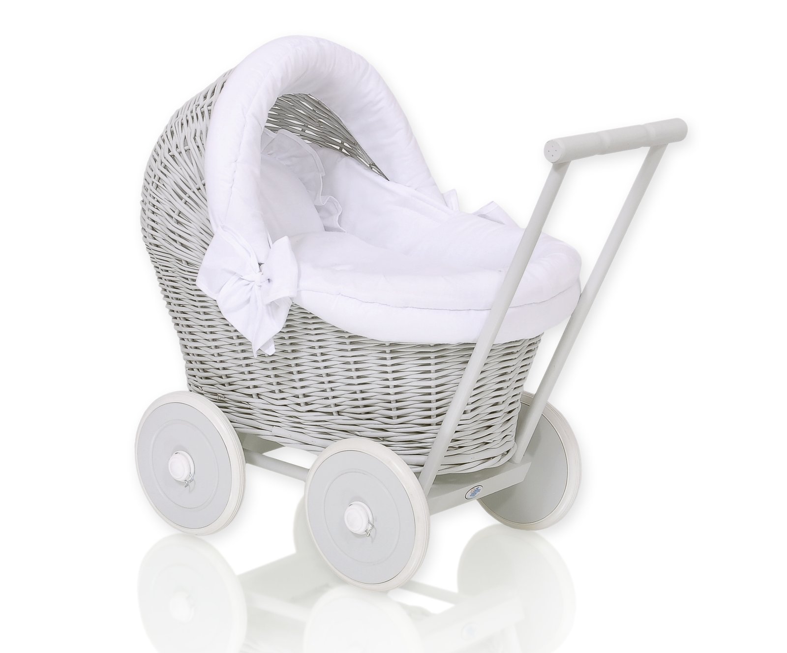 Wicker doll pushchair – made of natural wicker, on a natural wooden chassis with wooden wheels – grey painted.