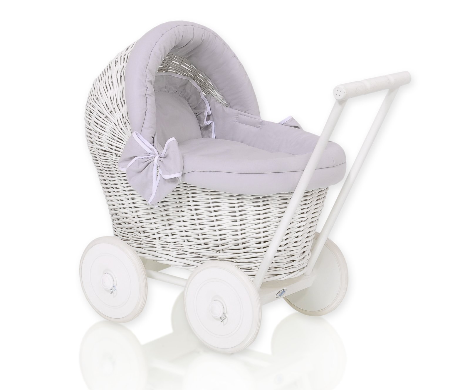 Wicker doll pushchair white with grey bedding and soft padding