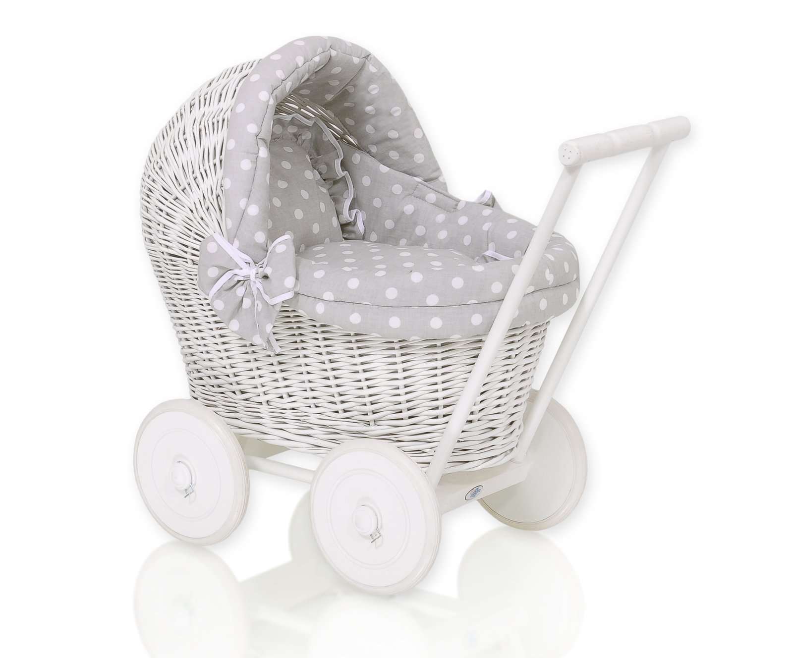 A great gift for a little girl – a beautiful wicker doll pushchair, stylish and unique. Handmade pram, top quality handicraft. Natural Polish wicker from ecological cultivation. The pram has a beautiful rounded shape. Wooden solid chassis made of natural beech wood, top quality. Sturdy stable handle makes it easy to steer the pushchair comfortably. Wooden wheels protected by a rubber tyre. The wheels are mounted on metal axles. A special “click-clack” safety device securely fastens the wheels and makes the wheels turn easily.