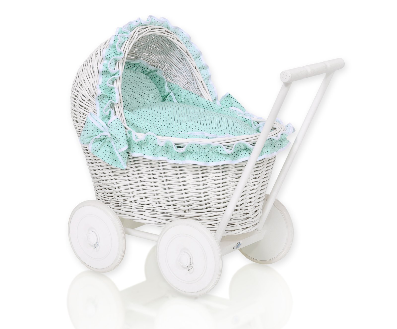 Wicker doll pushchair white with mint bedding and soft padding
