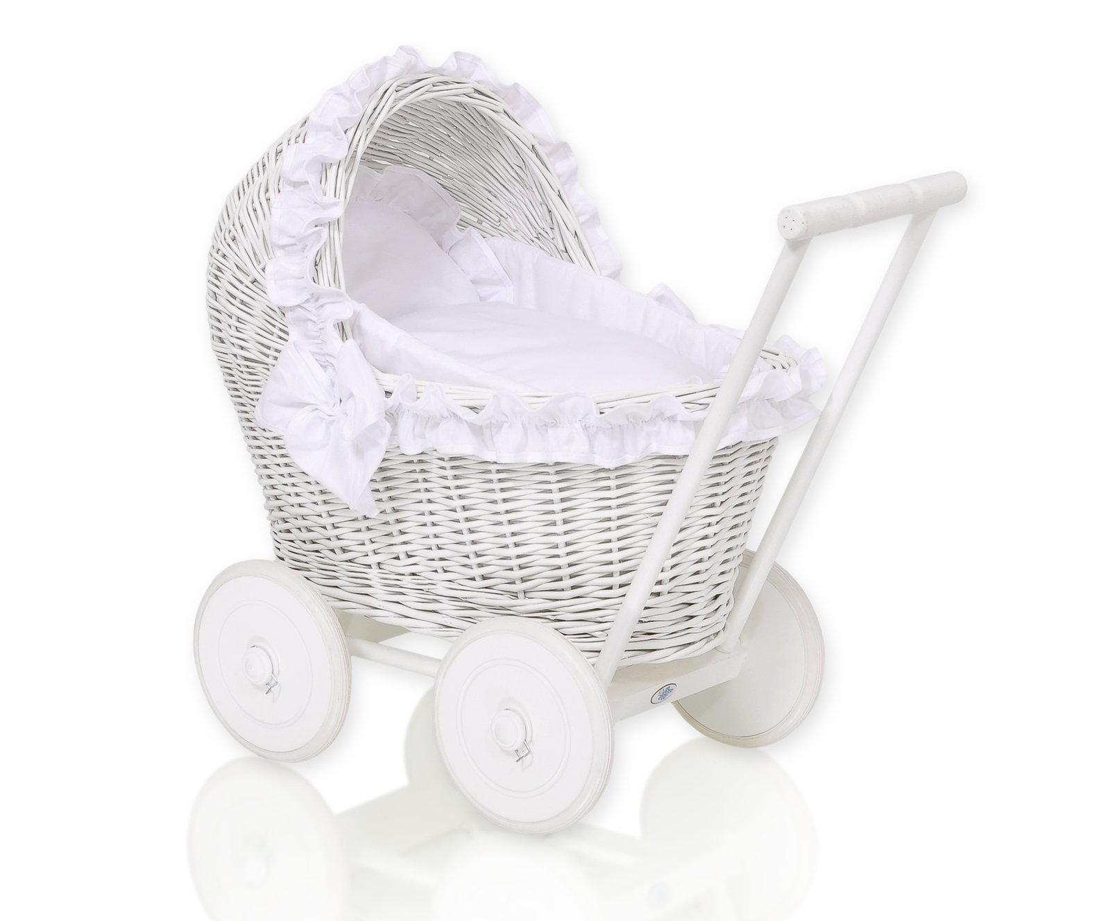 Wicker doll pushchair – made of natural wicker, on a natural wooden chassis with wooden wheels – white painted.