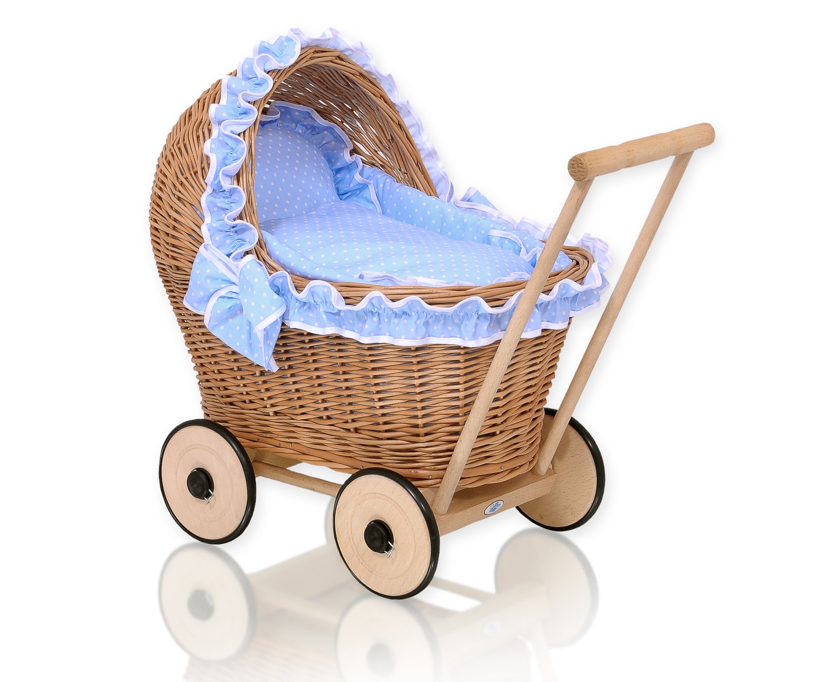 A great gift for a little girl – a beautiful wicker doll pushchair, stylish and unique. Handmade pram, top quality handicraft. Natural Polish wicker from ecological cultivation. The pram has a beautiful rounded shape. Wooden solid chassis made of natural beech wood, top quality. Sturdy stable handle makes it easy to steer the pushchair comfortably. Wooden wheels protected by a rubber tyre. The wheels are mounted on metal axles. A special “click-clack” safety device securely fastens the wheels and makes the wheels turn easily.