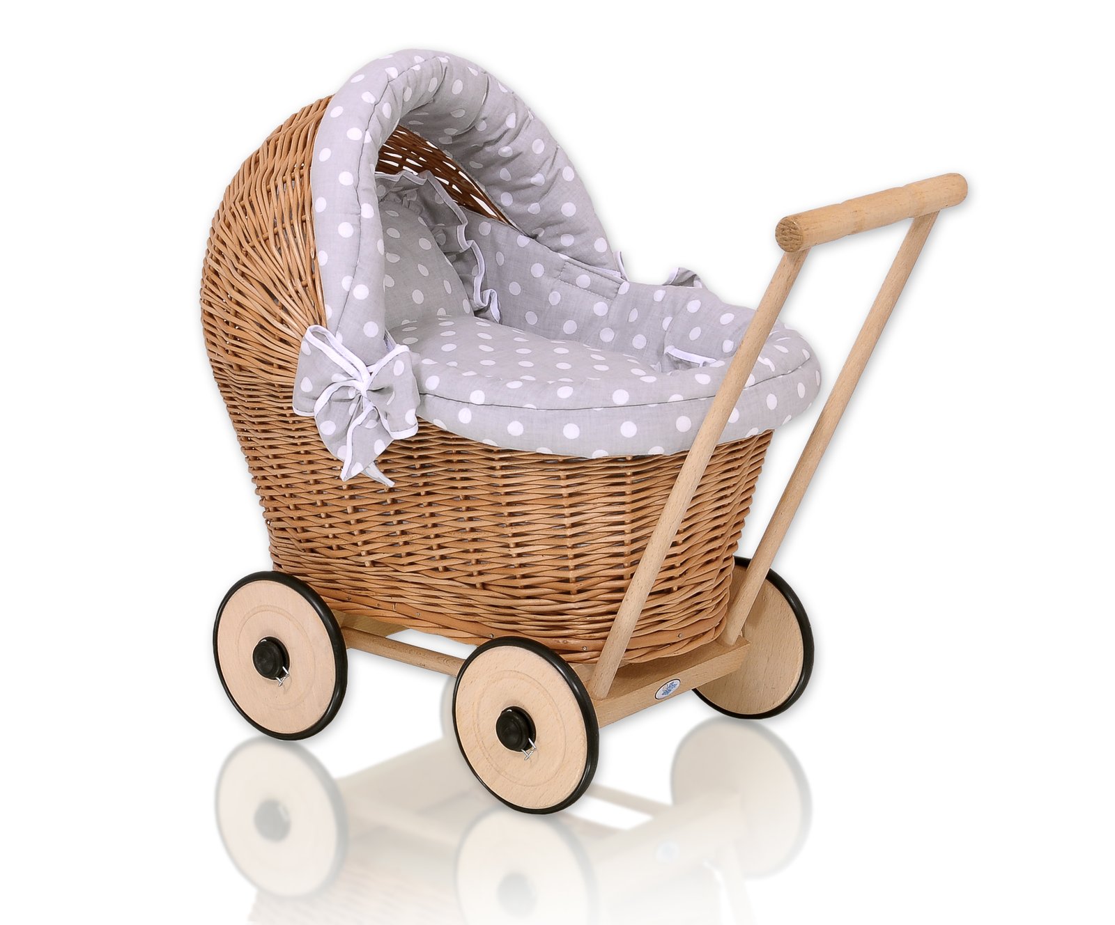Wicker doll pushchair with grey bedding and soft padding – natural