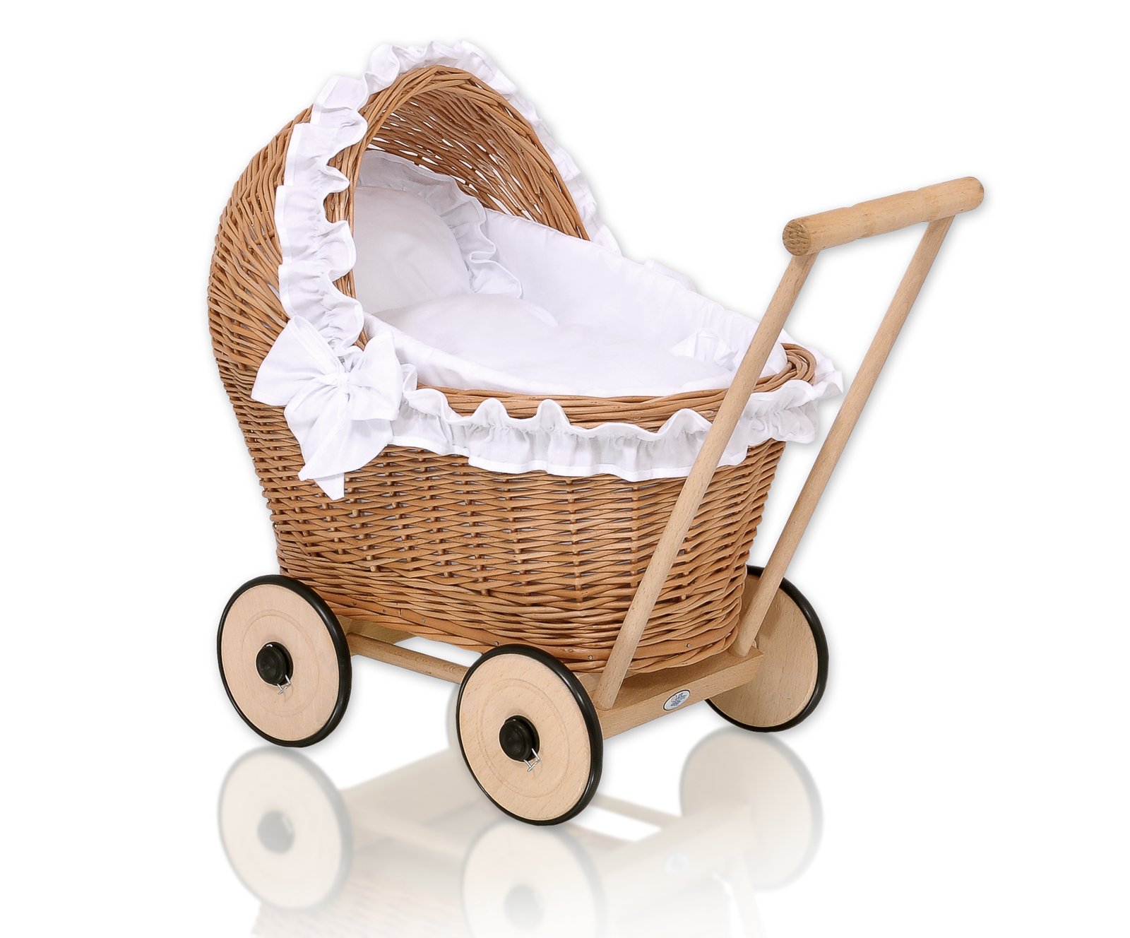 A great gift for a little girl – a beautiful wicker doll pushchair, stylish and unique. Handmade pram, top quality handicraft. Natural Polish wicker from ecological cultivation. The pram has a beautiful rounded shape. Wooden solid chassis made of natural beech wood, top quality. Sturdy stable handle makes it easy to steer the pushchair comfortably. Wooden wheels protected by a rubber tyre. The wheels are mounted on metal axles. A special “click-clack” safety device securely fastens the wheels and makes the wheels turn easily.
