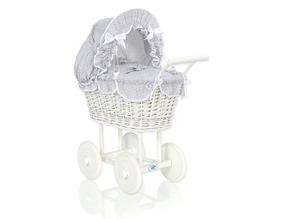 Wicker doll pram – made of natural wicker, on a natural high wooden chassis with wooden wheels – white painted.