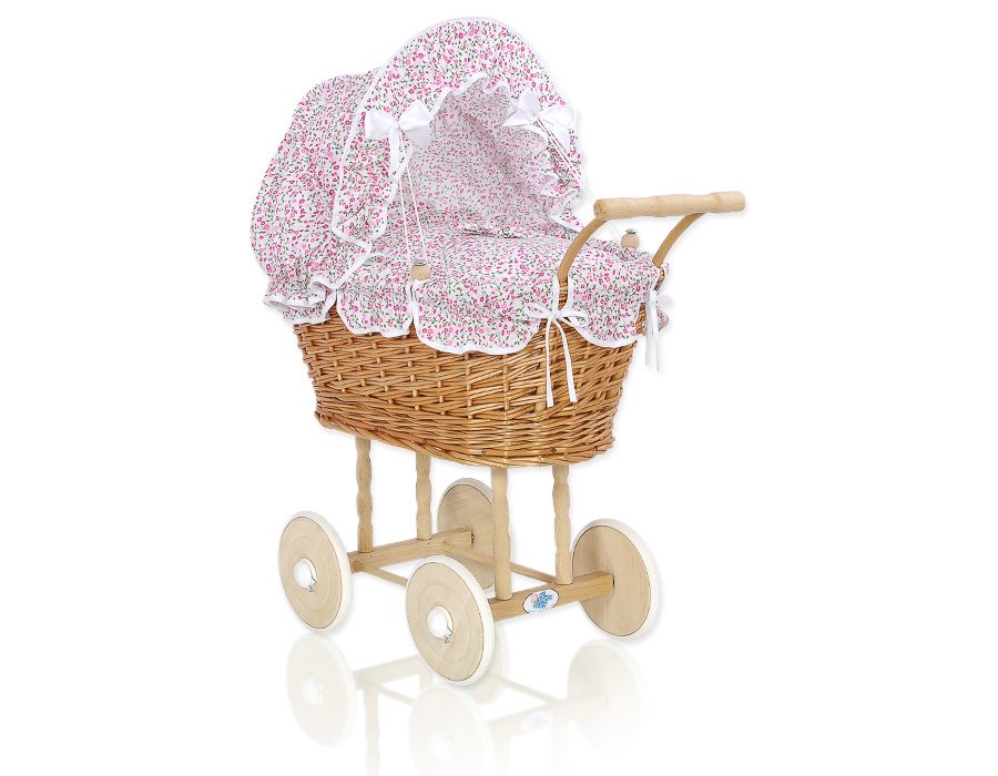 Wicker dolls’ pram with pink bedding and padding – natural